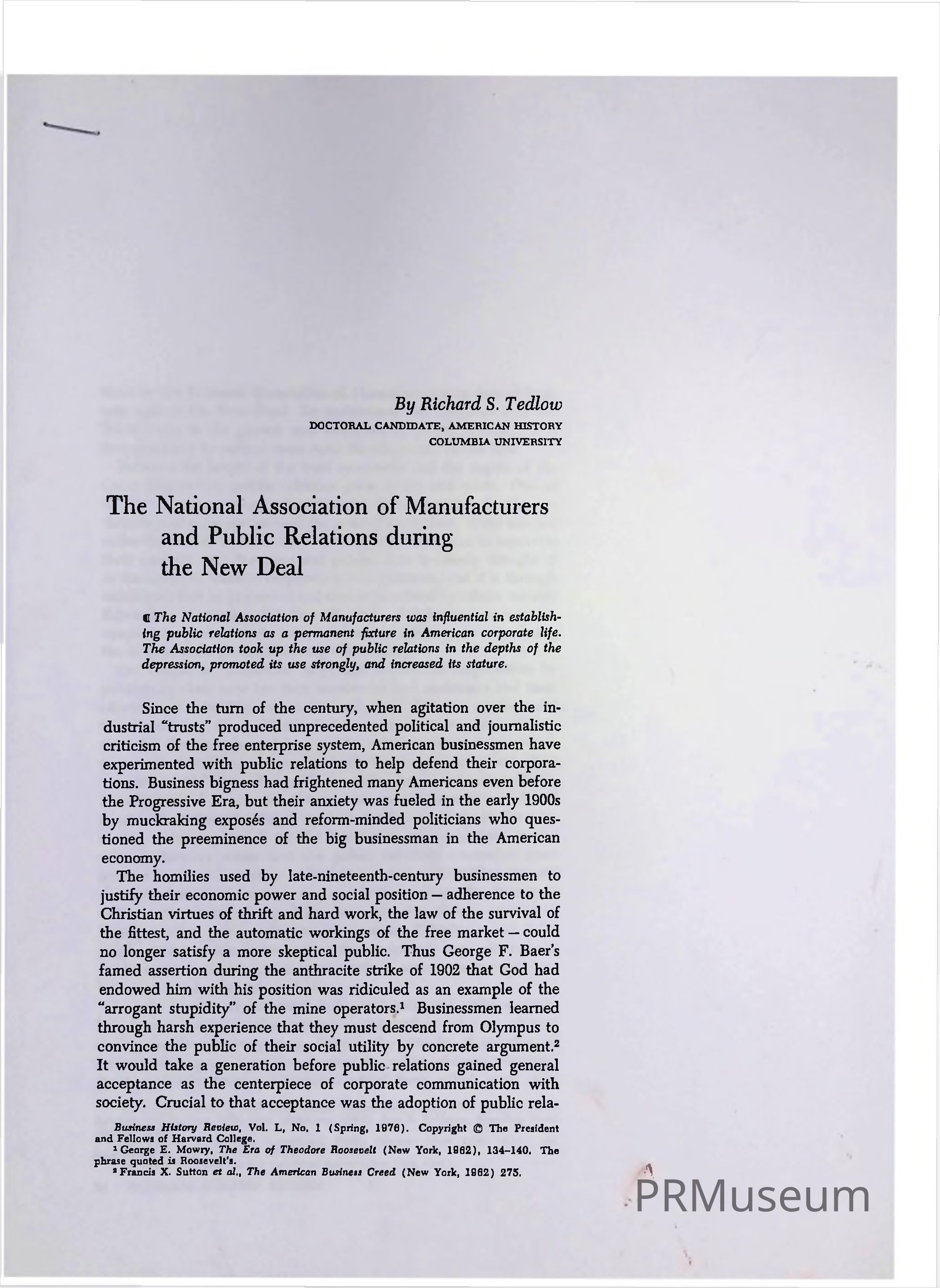 Richard S. Tedlow is a professor of Business Administration at Harvard Business School, where he is a specialist in business history and an alum of institution. In this paper, Tedlow focuses on the public relations strategies used by The National Association of Manufacturers during the New Deal and promoted it strongly following the Great Depression in the 1930s.Publication Details