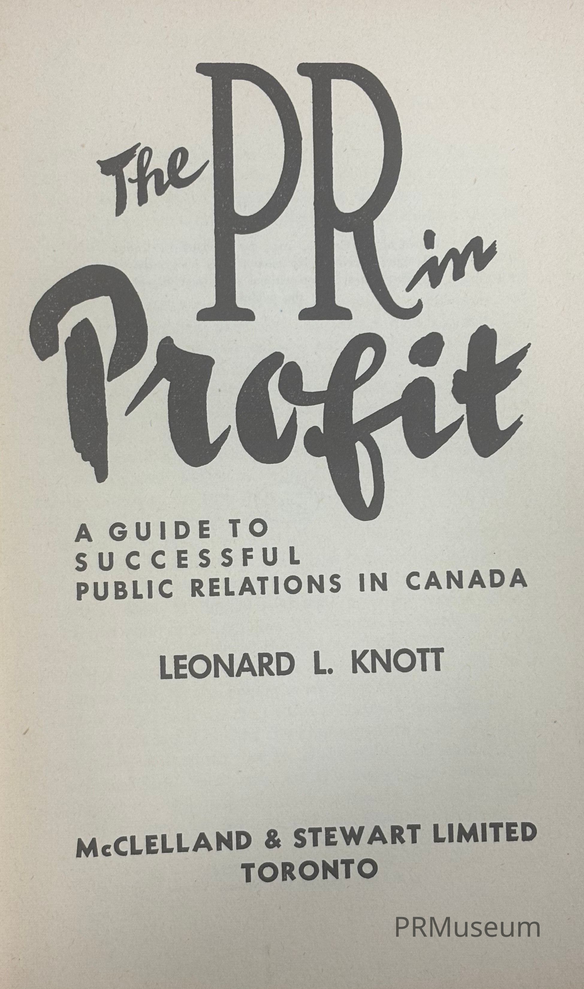 Leonard L. Knott was President of Editorial Associates Limited, Montreal and President of Inside Canada Public Relations Limited. "The PR in Profit" focuses on the practice of public relations and the techniques used to create good and bad public relations as well as citing case histories from previous campaigns.Acquisition
