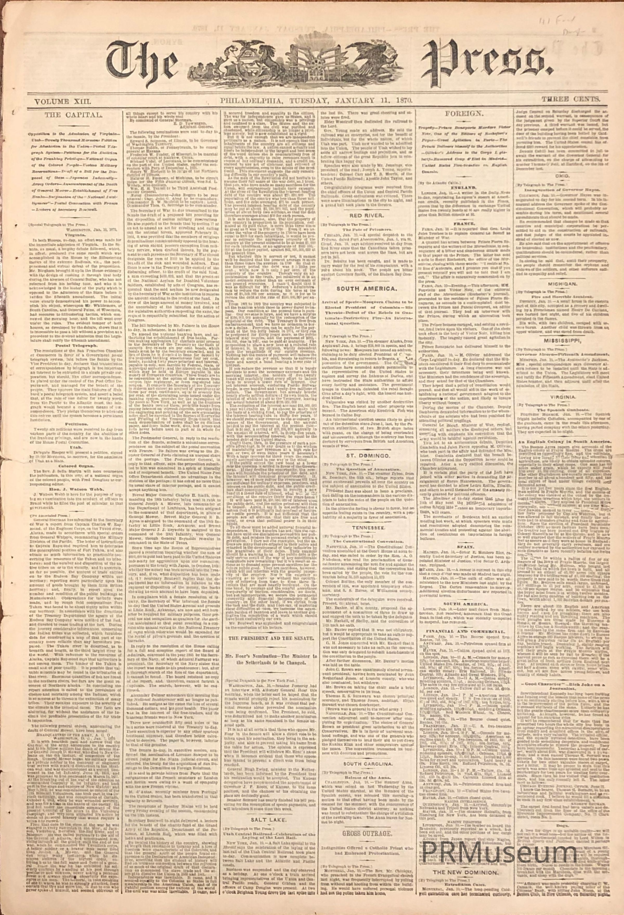 Page One story, "Colored Organ," announces the Reverend J. Sella Martin will soon commence the publication in the city, of a national organ of the colored people, with Frederick Douglass as corresponding editor. (Would be published in Washington, D.C.)
