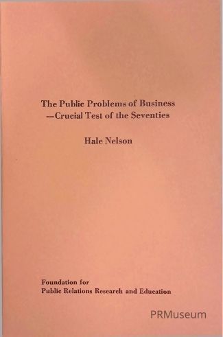 Hale Nelson was Vice President of the public relations counseling firm, Cook, Nelson, Tuthil, Inc and was in charge of urban affairs Illinois Bell Telephone Company in 1967. In his address, Nelson discusses corporations suffering from a decline in public support and the public supporting protests with anti-corporate sentiments. Nelson explains that the key point of communicating is "what you already know: that always shaping the acceptance or rejection of what we say is who we are and what and how we do. Or if you prefer, our reputation".Acquisition