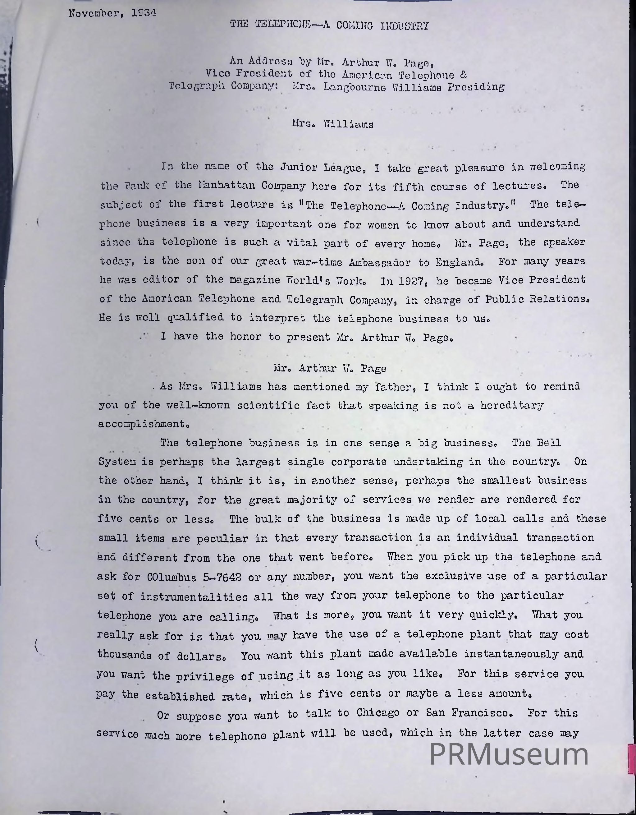 Speech given by Arthur W. Page, Vice President of AT&T, discussing the history of Bell Telephone and the advancement of the telephoneAcquisition