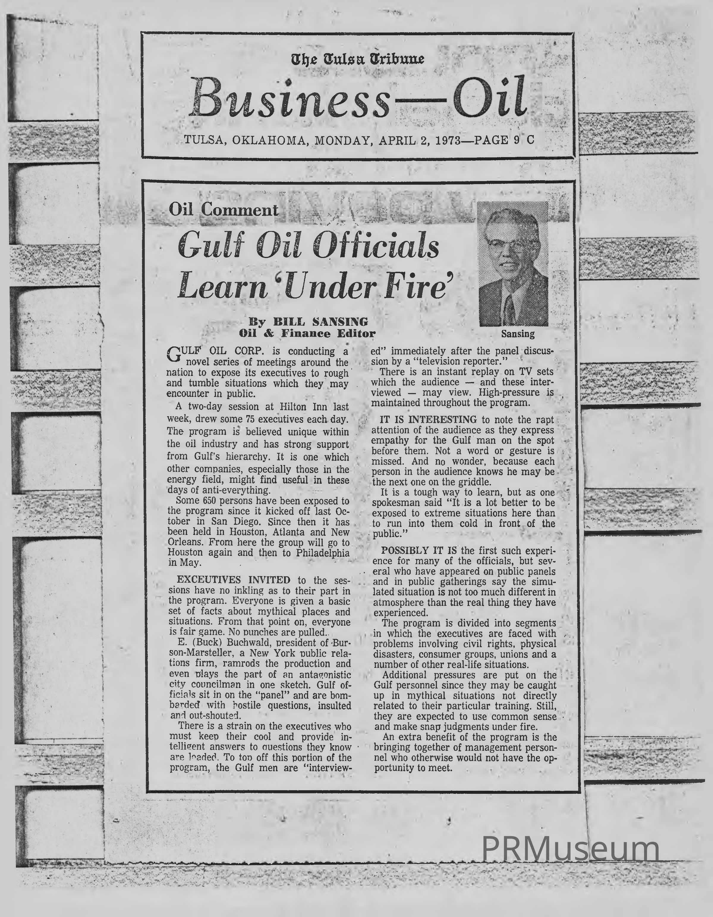 Oil Commentary written by editor Bill Sansing who mentioned Elias "Buck" Buchwald, President of Burson-Marsteller at the time of publication. In this article, Sansing wrote about executives who were invited to Oil Industry meetings, a two day session at Hilton Inn in late March of 1973.Publication Details