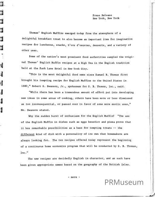 Thomas English Muffins, a well-known North American brand of English muffins and bagels, celebrated its 100th anniversary in 1980. Glory Read, a public relations executive, led the promotional campaign for the milestone, which included a press kit and a complimentary recipe booklet. As part of S.B. Thomas, Inc.’s ongoing home economics program, Read enthusiastically wrote about new and emerging recipes featuring the English muffin.Acquisition