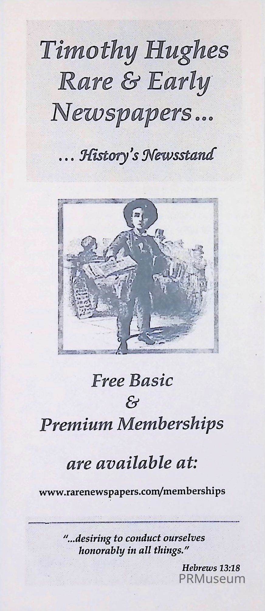 Timothy Hughes Rare & Early Newspapers are dealers in rare newspapers since 1976 and currently serve as consultants to the Freedom Forum Newsum and are members of the American Antiquarian Society. They currently hold an inventory of nearly two million newspapers and 18th century magazines.Created By
