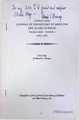Three copies of reprint, original. Handwritten on one copy by Bernays on cover: To my 250 IQ friend and inspirer, Claire Mays —Edward L. Bernays. As found in Bernays's Inbox.Created By