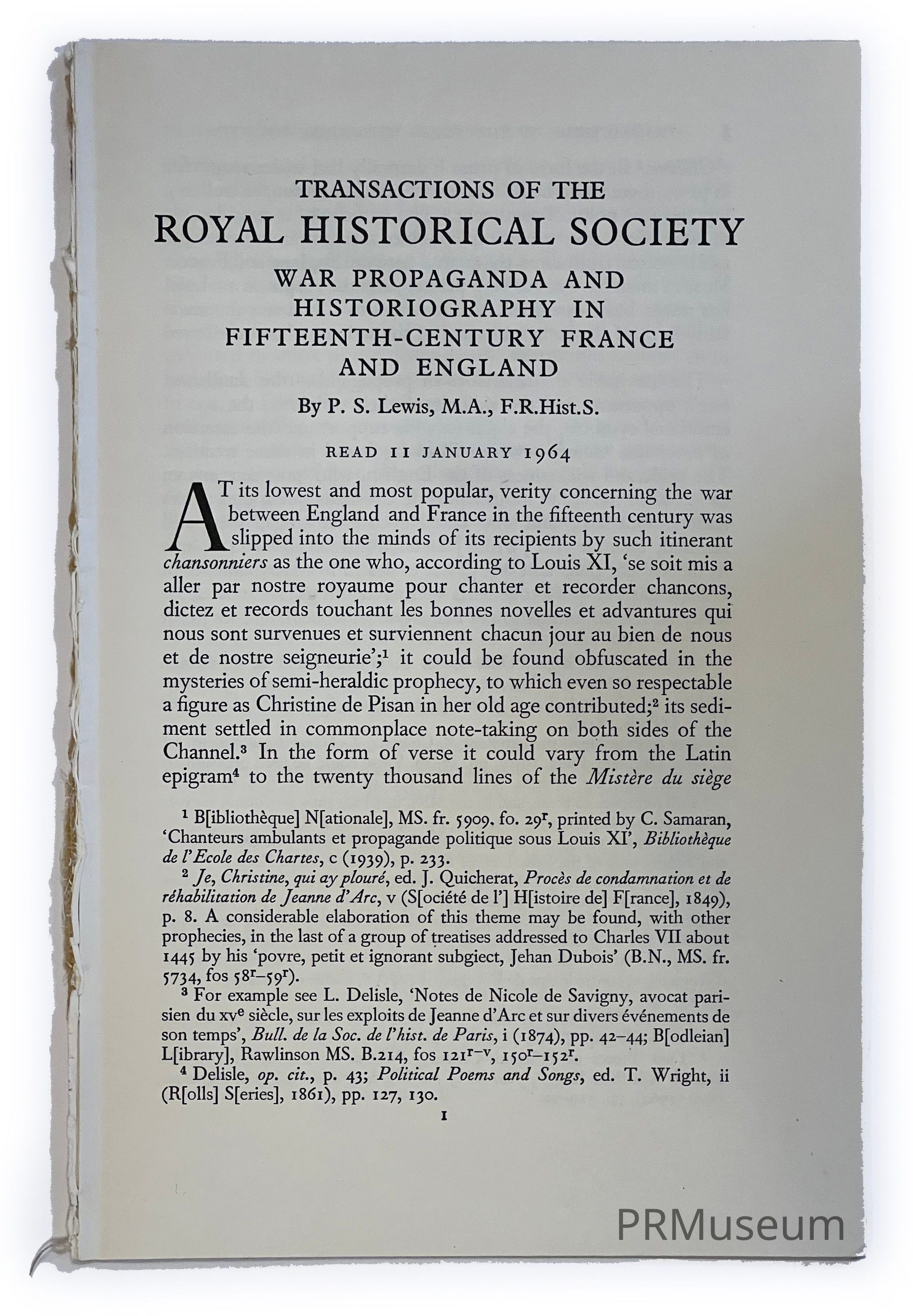 P.S. Lewis was a writer and submitted scholarly articles for the the Royal Historical Society, an organization dedicated to scholarly studies of history. In this article, Lewis discusses the weaponization of propaganda used between France and England and whether or not England had a claim to the French throne.Book Details