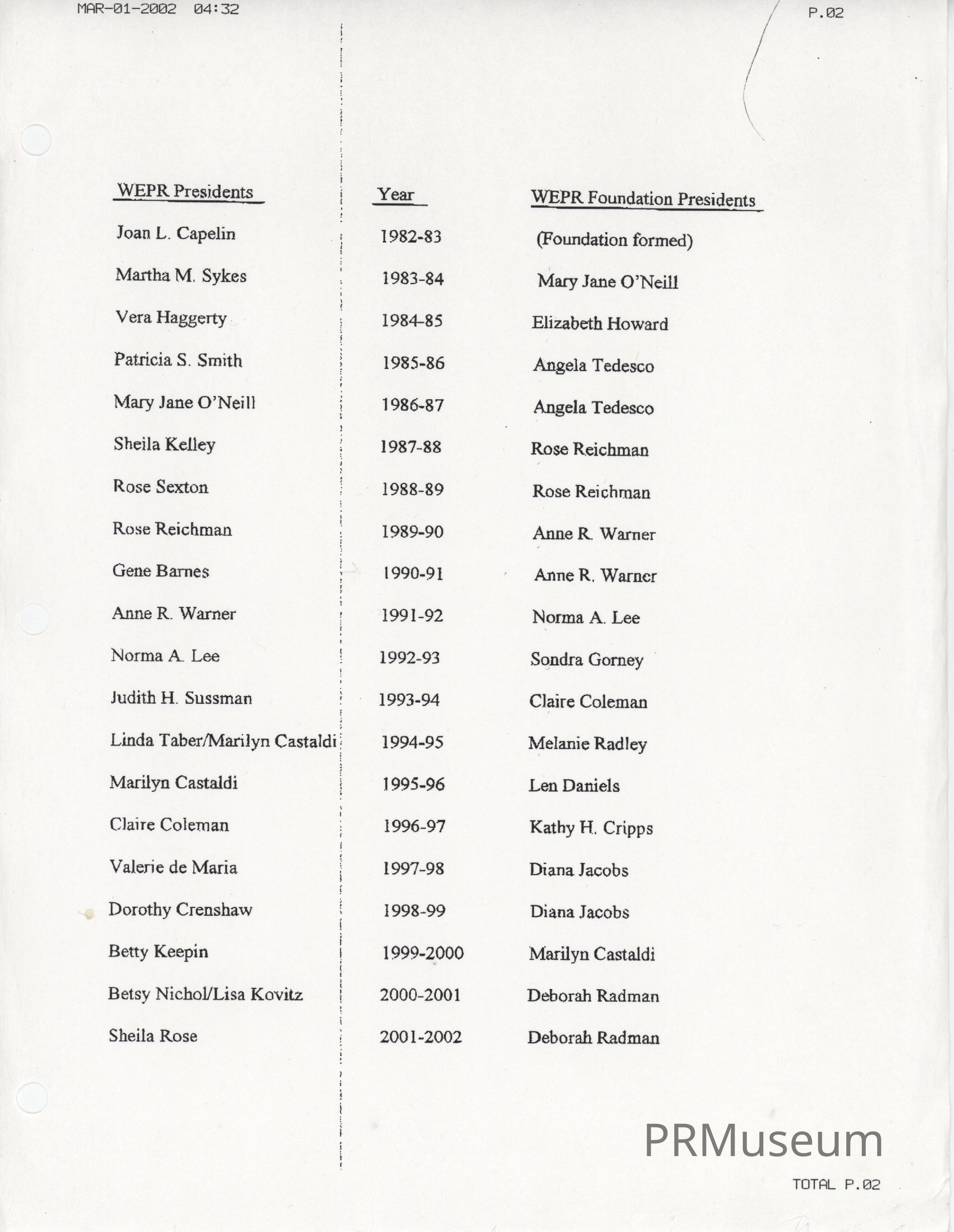 List of WEPR Presidents and Foundations Presidents from 1982 till 2002Acquisition