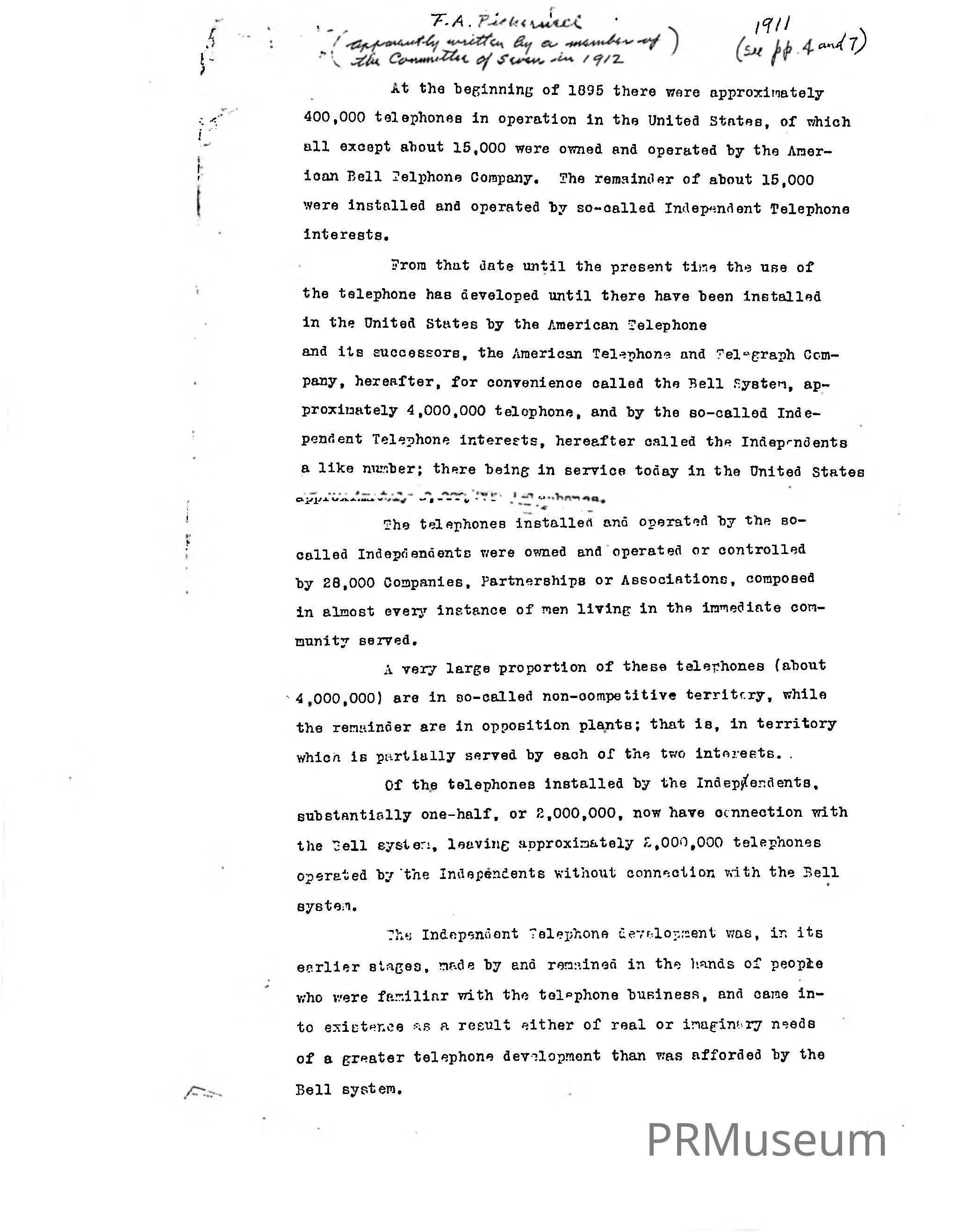 The Committee of Seven was a part of United States Senate. This report was apparently written by a member of the committee who was discussing the exponential growth of telephones in the United States in 1912. The author also discussed "Independent Telephone" development, which were telephone companies that were not associated with the Bell System.Created By