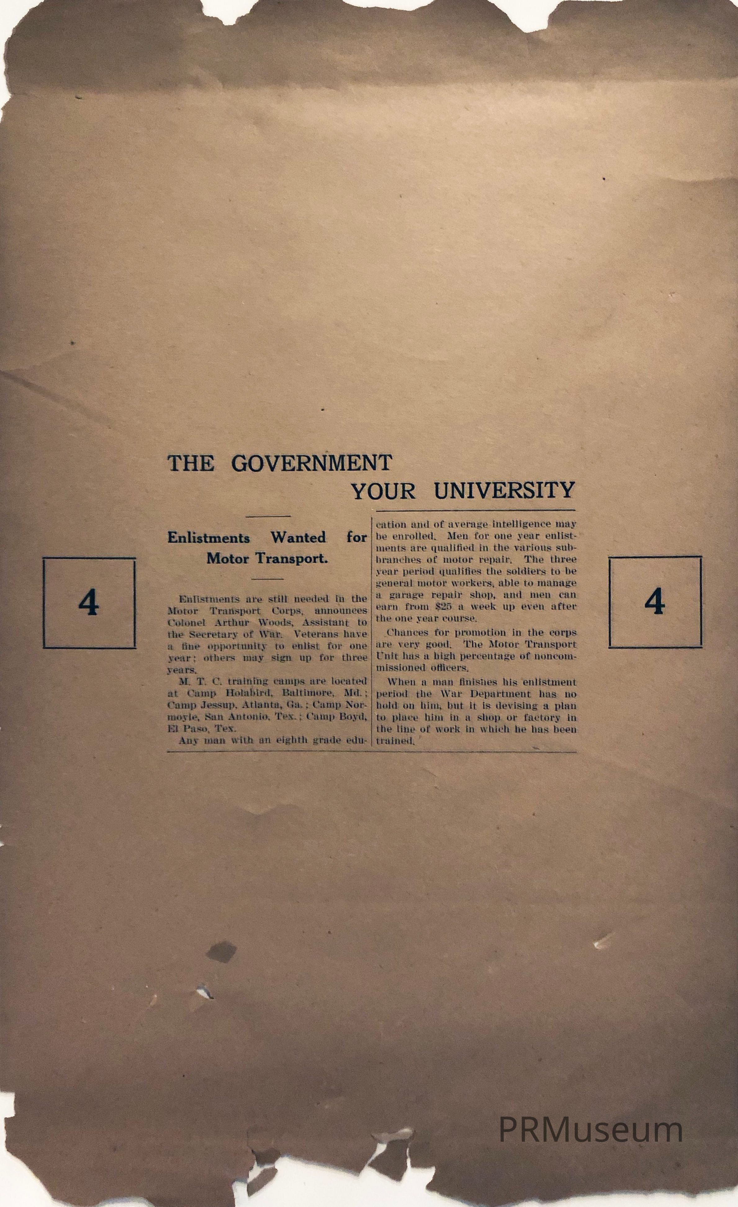WWI Mat #4 from the Office of Assistant to Secretary of War: The Government Your University: Enlistments Wanted for Motor TransportEntry/Object ID