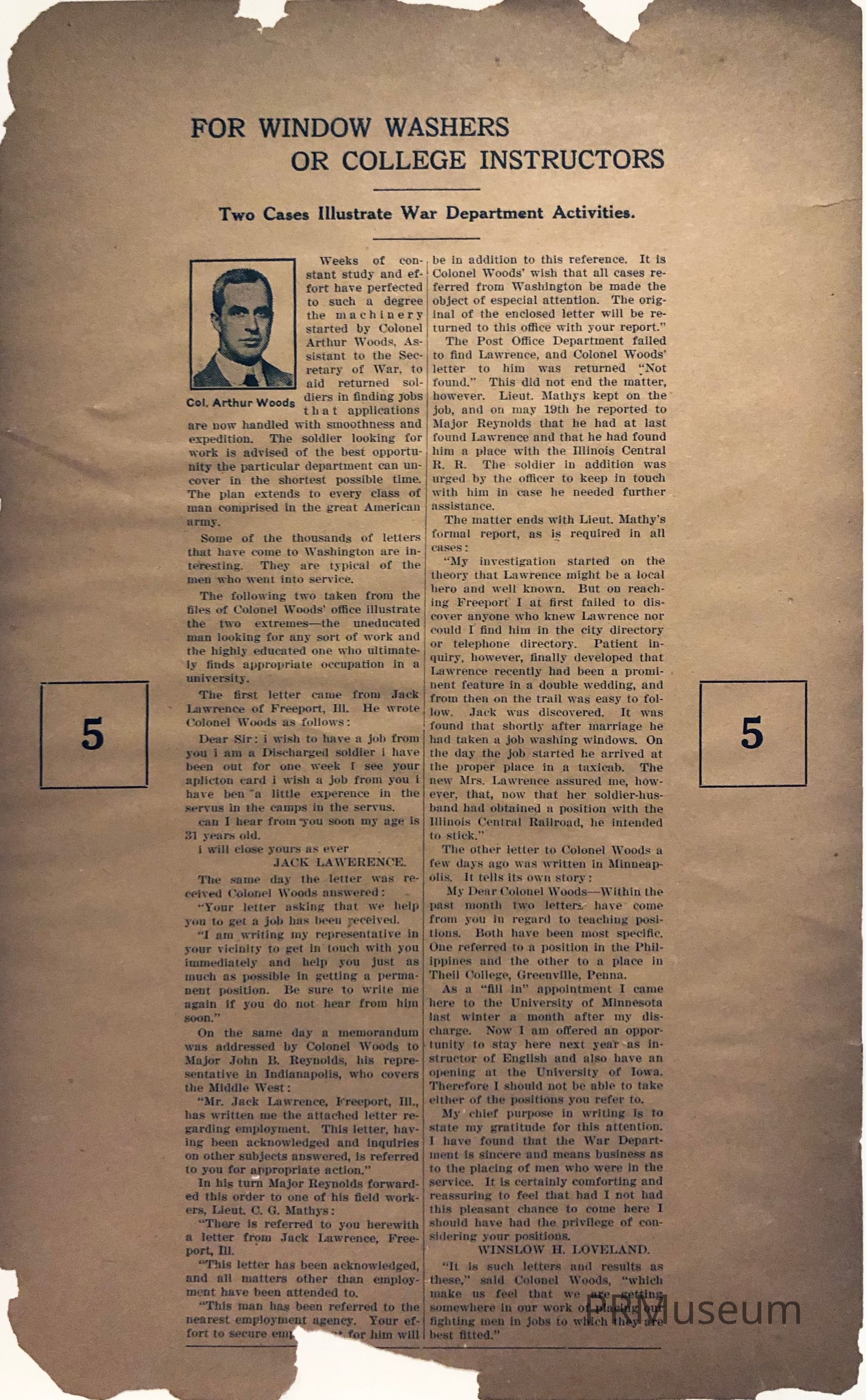 WWI Mat #5 from the Office of Assistant to Secretary of War: For Window Washers Or College Instructors: Two Cases Illustrate War Department ActivitiesEntry/Object ID
