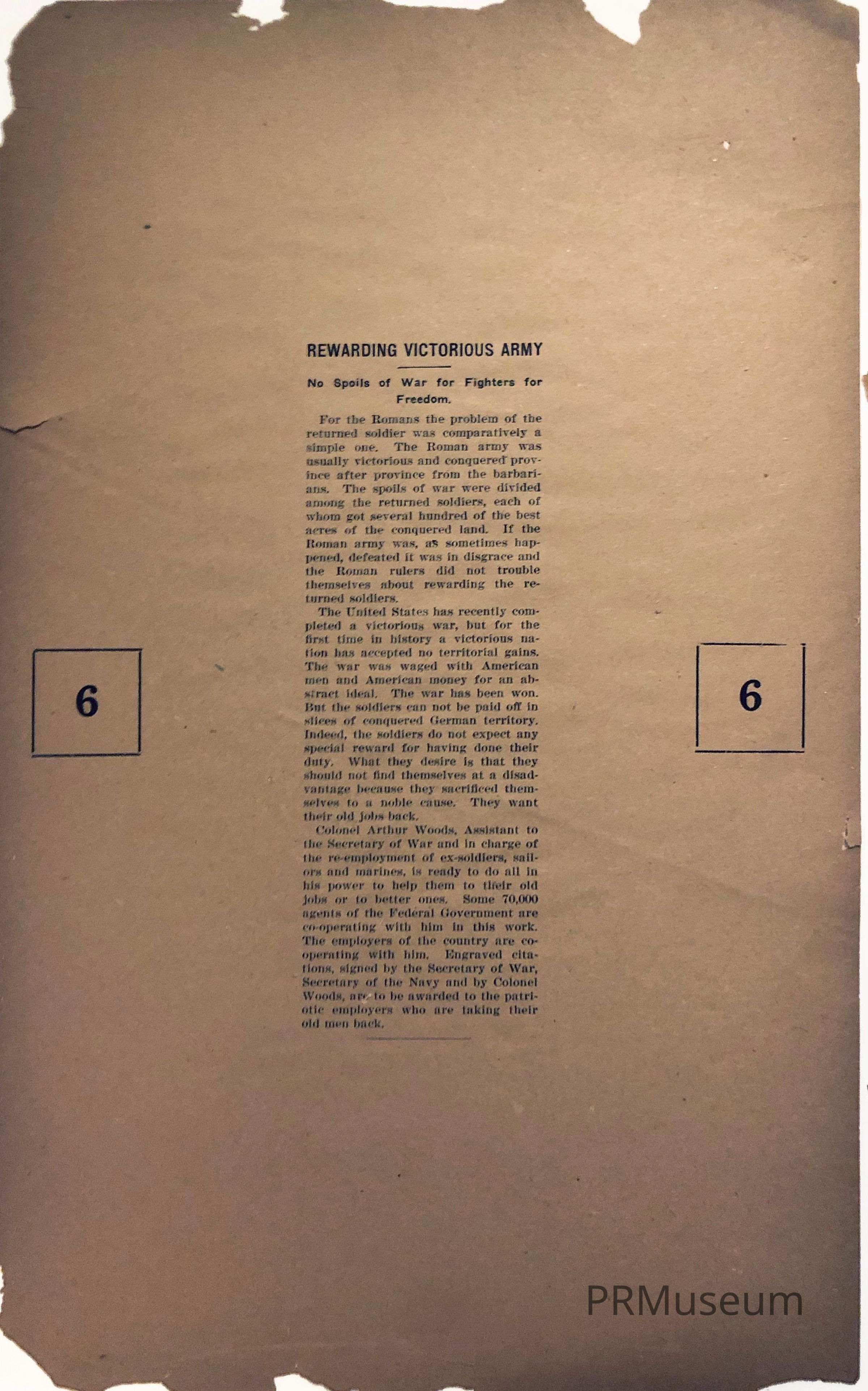WWI Mat #6 from the Office of Assistant to Secretary of War: Rewarding Victorious Army: No Spoils of War for Fighters for FreedomEntry/Object ID