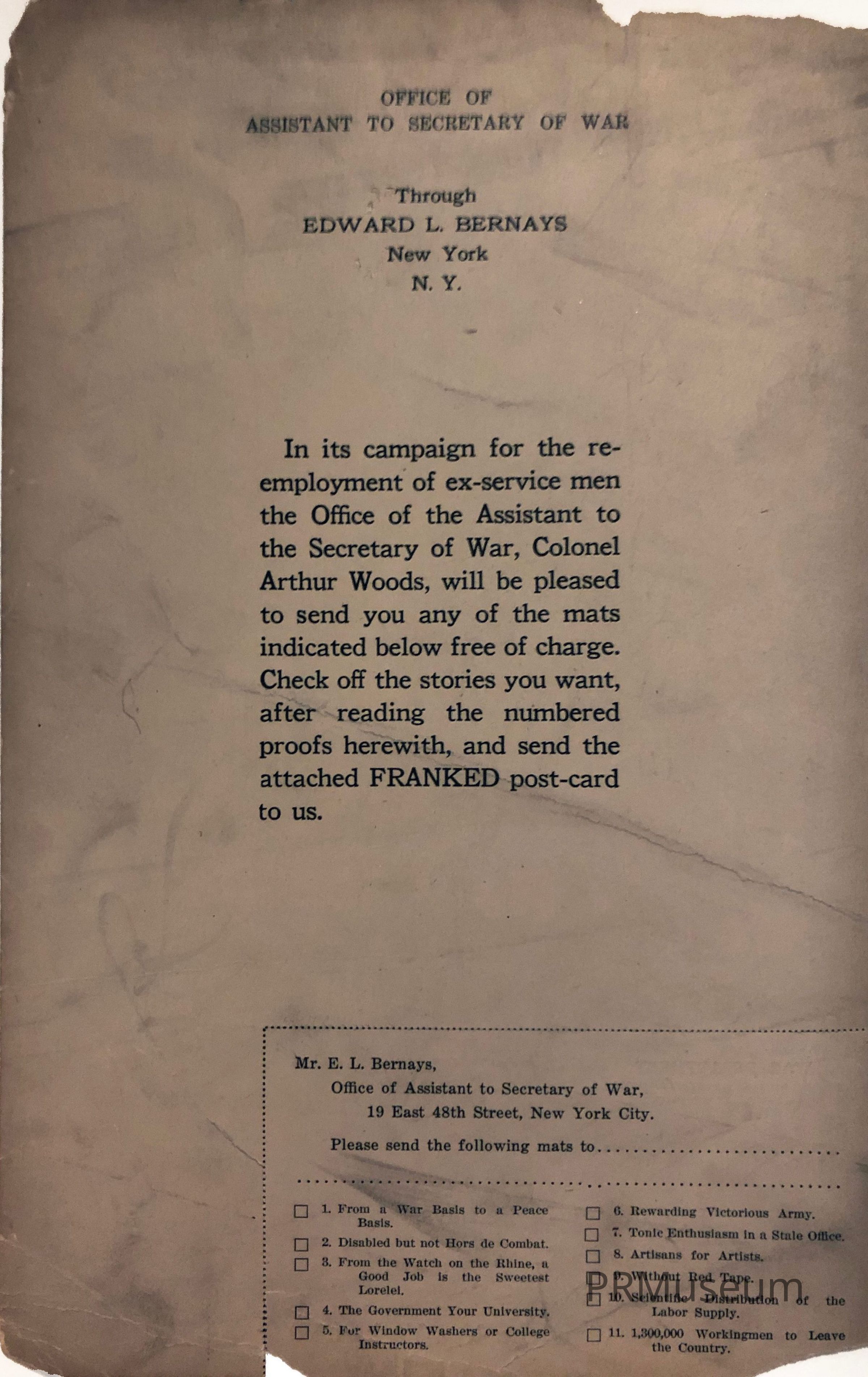 WWI Mats from the Office of Assistant to Secretary of War: cover page and postcardEntry/Object ID