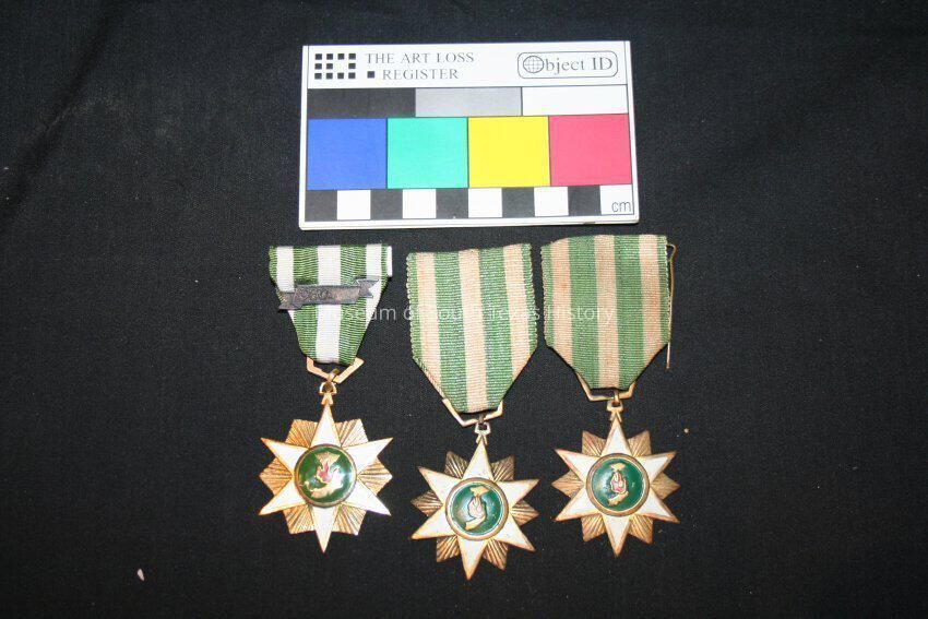 Republic of Vietnam Campaign medal awarded to Alfredo "Freddy" Gonzalez. Medal includes a green and white stripe ribbon; metal banner-shaped pin with "1960-" attached to ribbon; and a multi-point star of gold tone and white, red, and green enamel details. Two short prongs on reverse.Collection