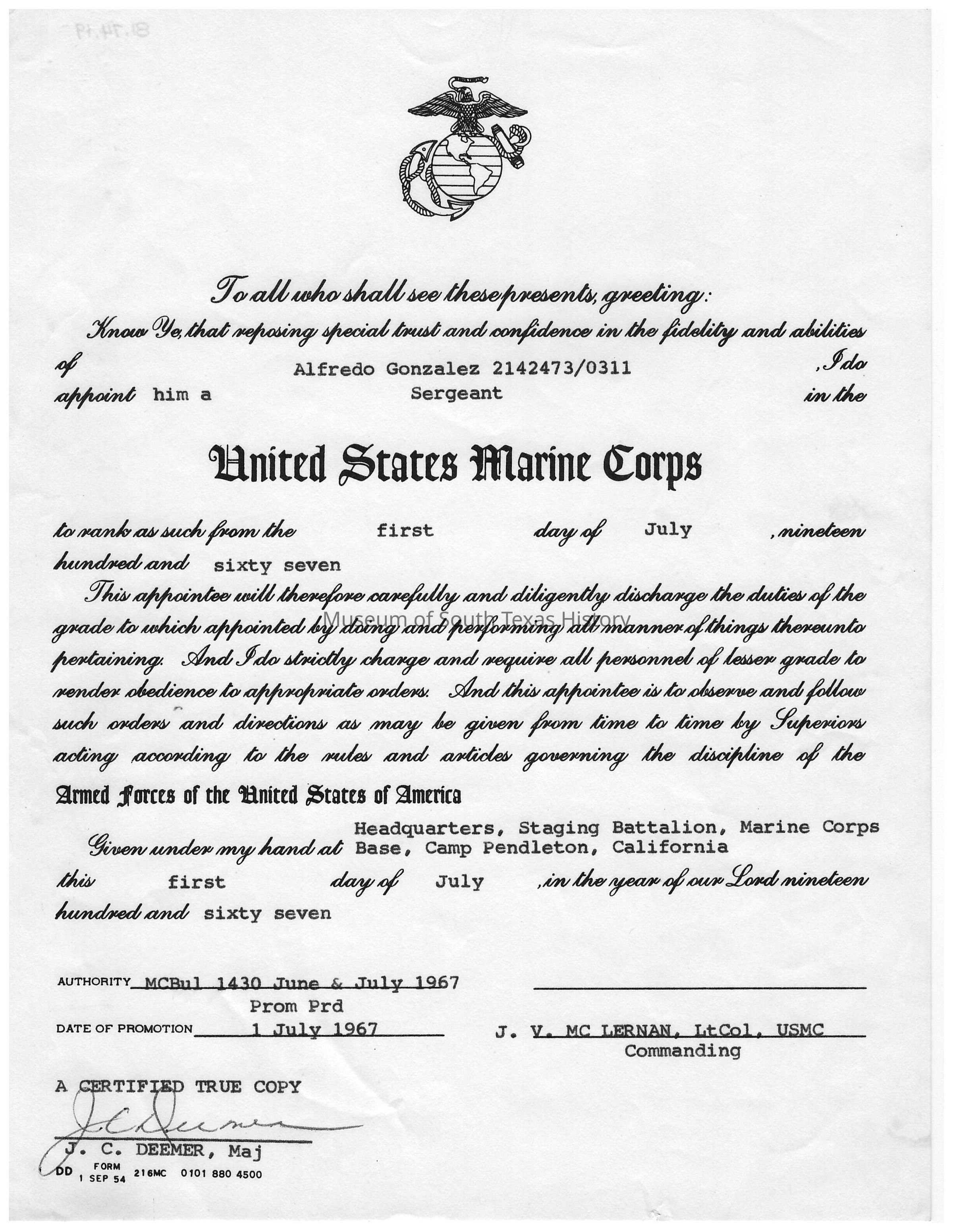 Certificate of Promotion to Sergeant issued to Alfredo "Freddy" Gonzalez