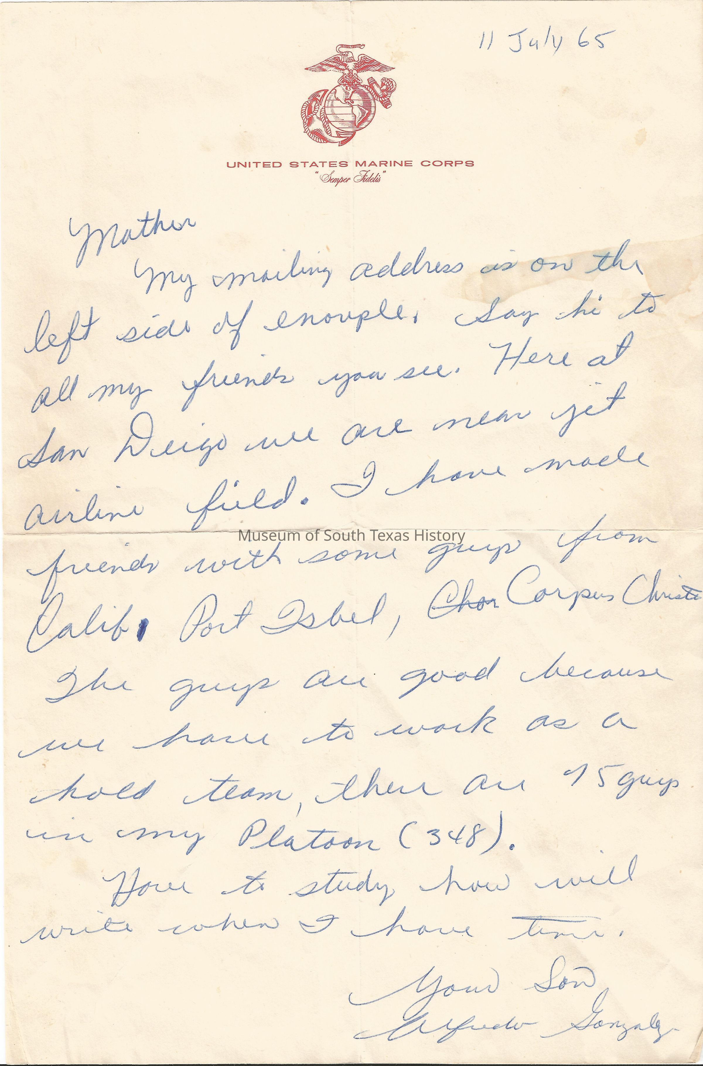 Letter dated July 11, 1965. Written by Alfredo Gonzalez to his mother DoliaCollection