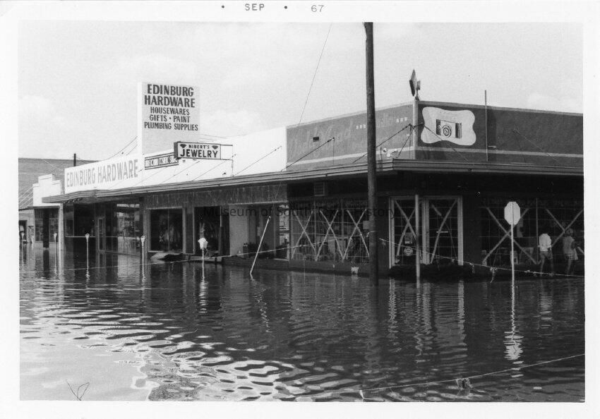 Views in and around Edinburg in the aftermath of Hurricane Beulah, 1967. The system made landfall in Texas around late September and caused major flooding, wind, and tornado damage.