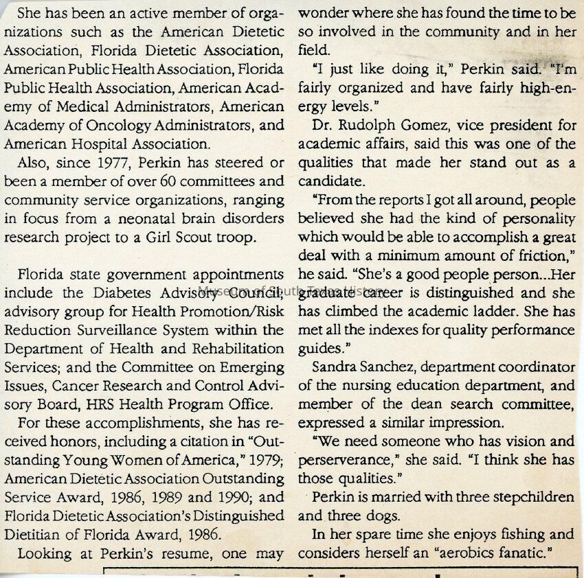 Newspaper article "New Health Science dean wants community outreach" from the Daily Review. Dr. Judy Perkin was the first woman appointed to an academic dean's position at the University of Texas Pan American.Collection