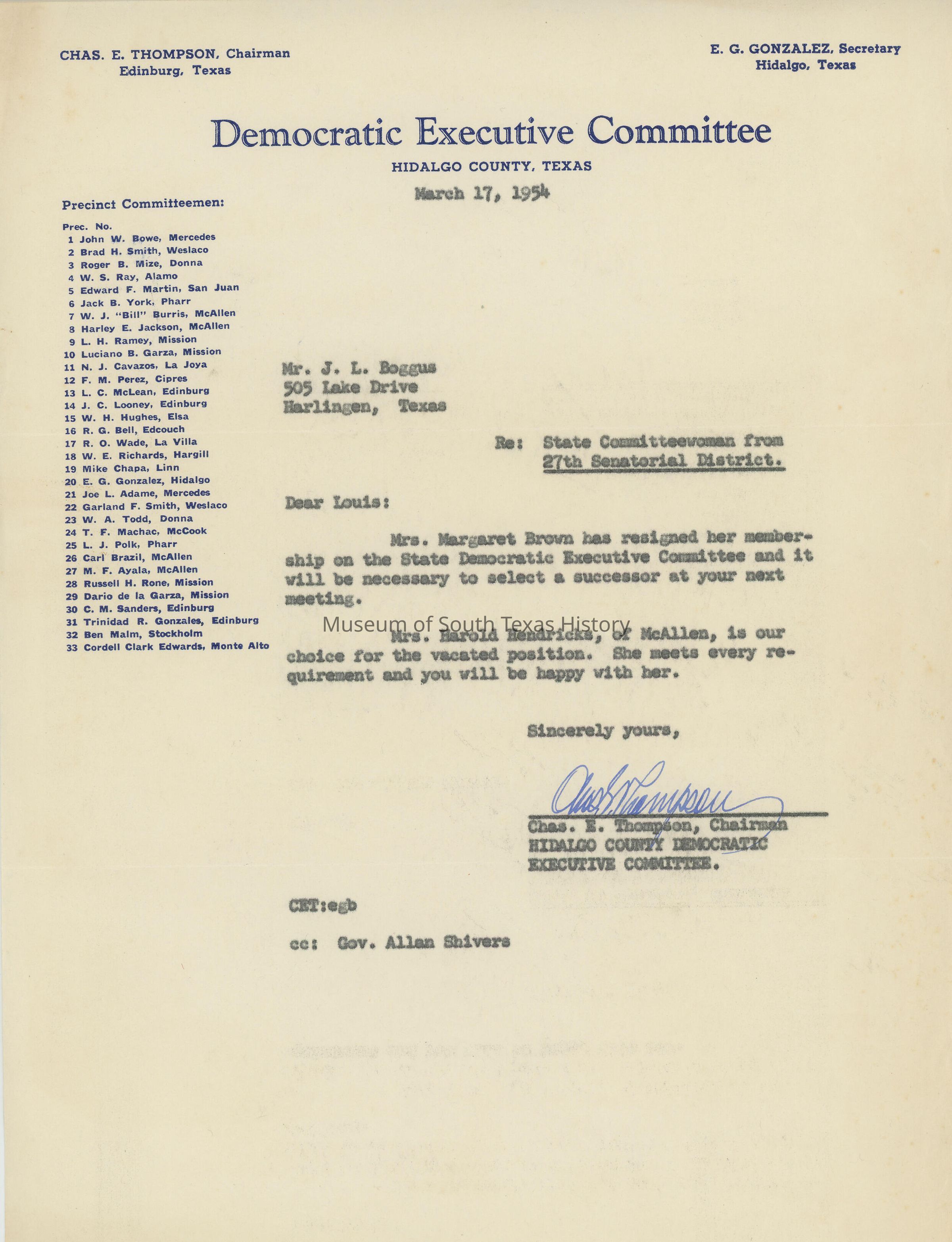 Correspondence from the 1950s when Lucile Hendricks served on the State Democratic Executive Committee. Ms. Hendricks wore many different hats over the course of her life. She learned the building trade from her husband and took over the reigns of his construction company after his death in 1964. She was one of the first women building contractors. She ran and was the first female elected to any office in Hidalgo County, becoming the first woman member of the McAllen Independent School Board, serving for many years and ultimately becoming President of the Board. She served many years on the Planning and Zoning Commission, The Board of Adjustment and Appeals, and The McAllen Housing Authority. She was a member of DAR, Zonta International, Republican Women, and a founder of the McAllen Citizen's League. She was a life member of PTA and the first person selected McAllen Chamber of Commerce "Woman of the Year".