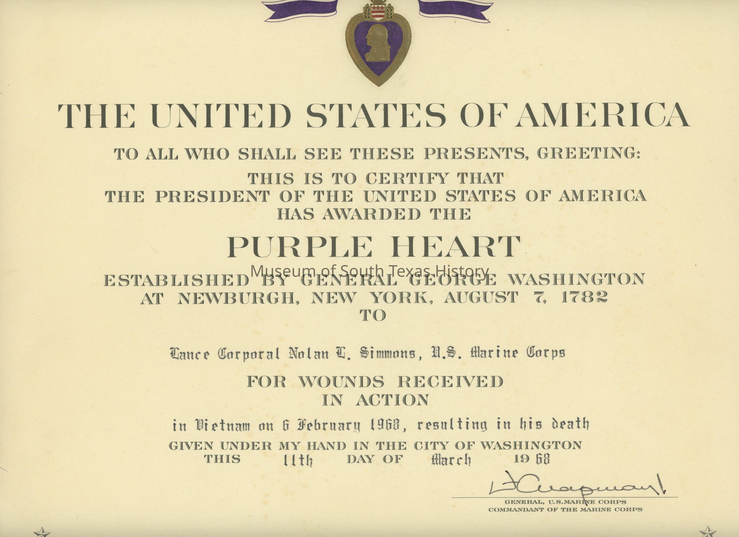 Certificate awarding Purple Heart to Nolan L. Simmons for wounds received in action resulting in his deathCollection