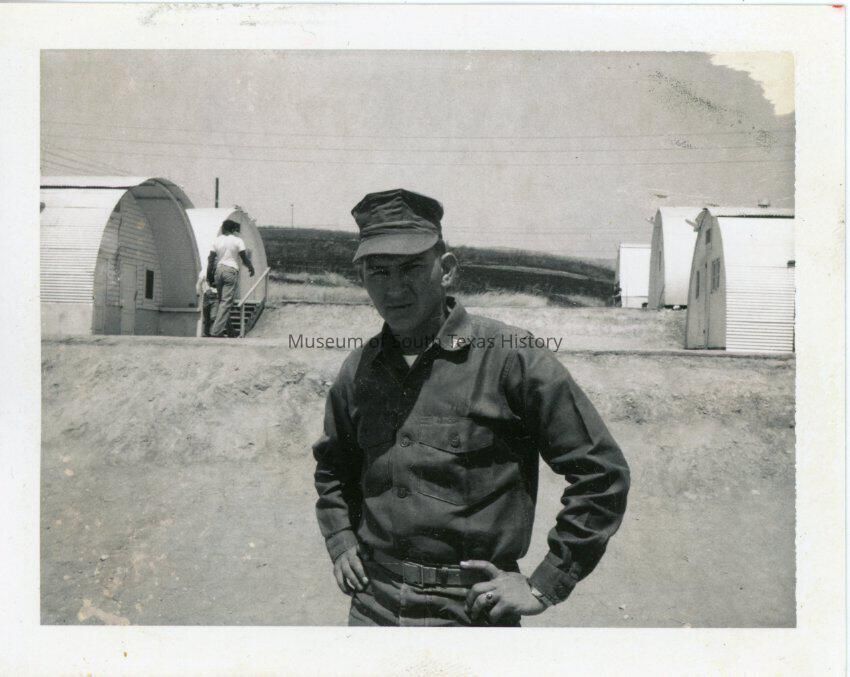 Black and white photograph showing Freddy González in a military camp. The image shows González from the waist up in uniform. Five Quonset huts are in the background. There is evidence in the upper right corner of the photograph that it is a photograph of a photograph.