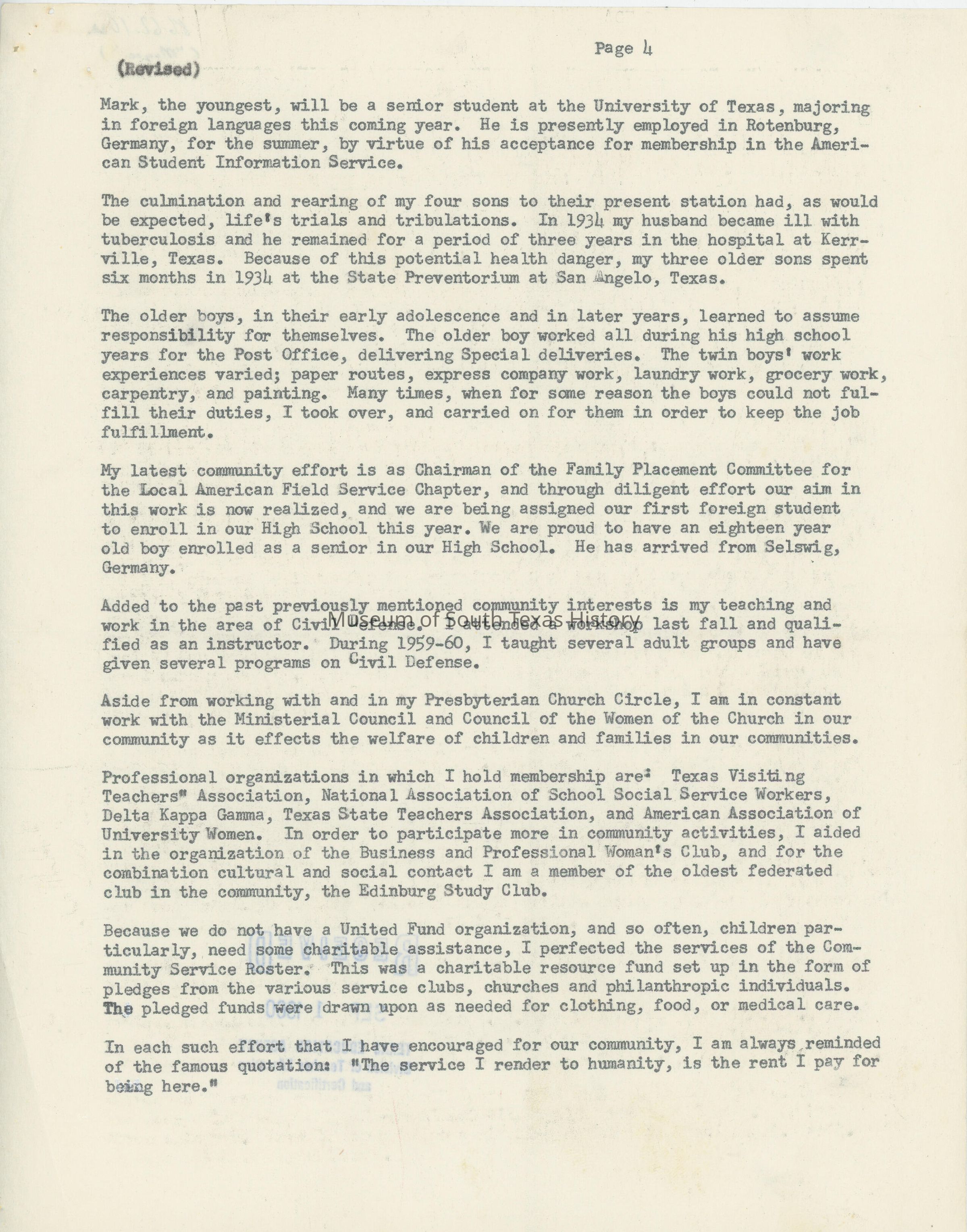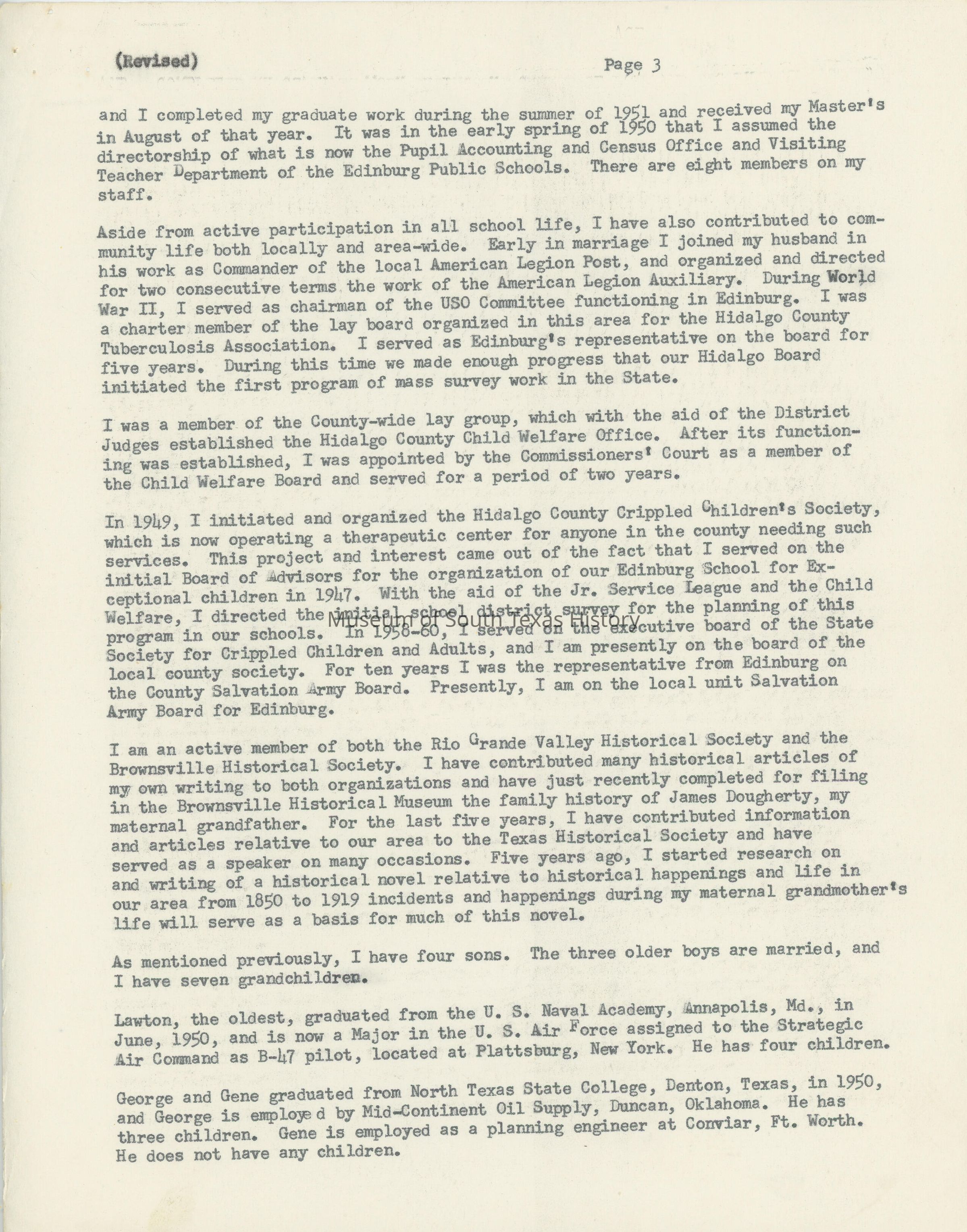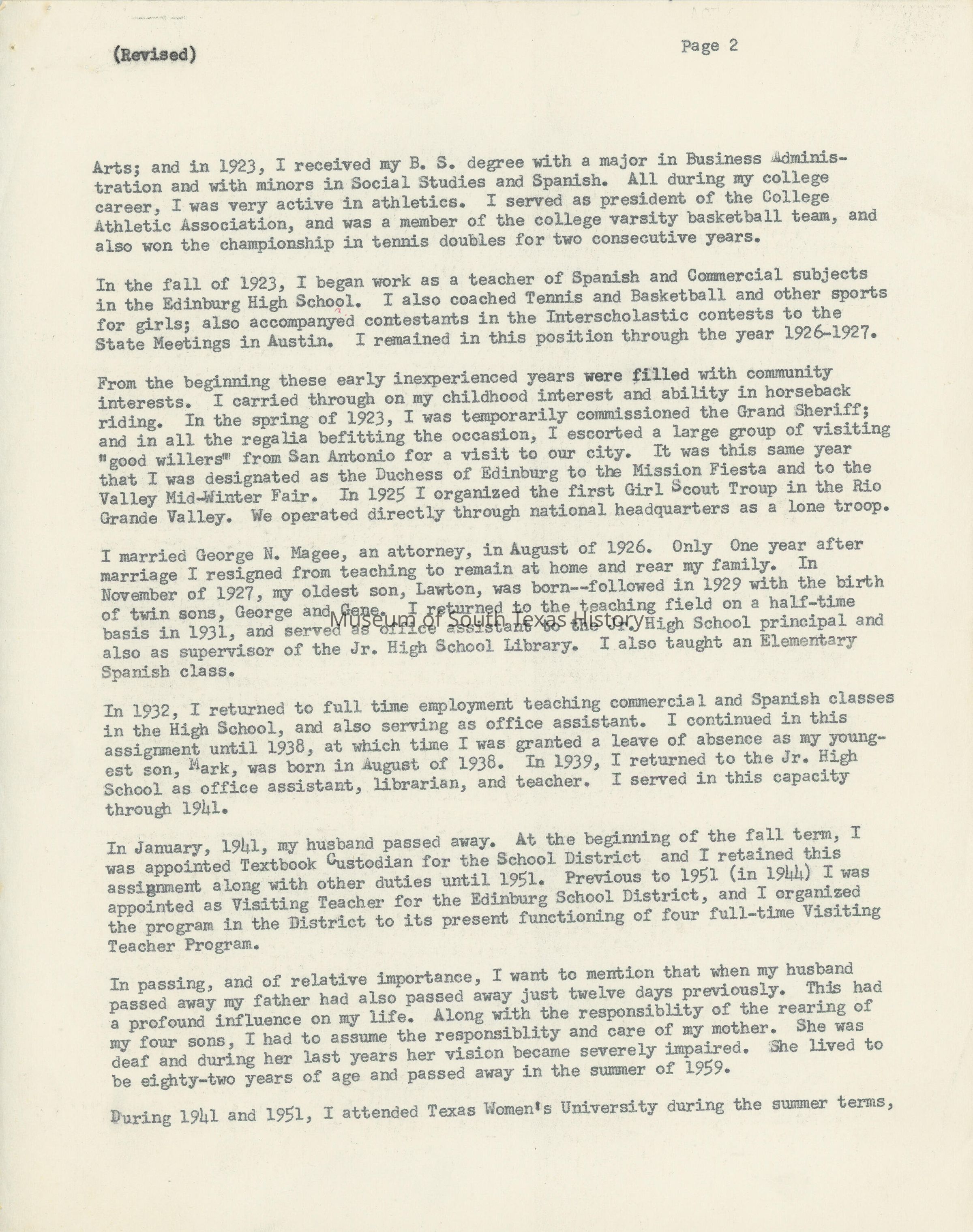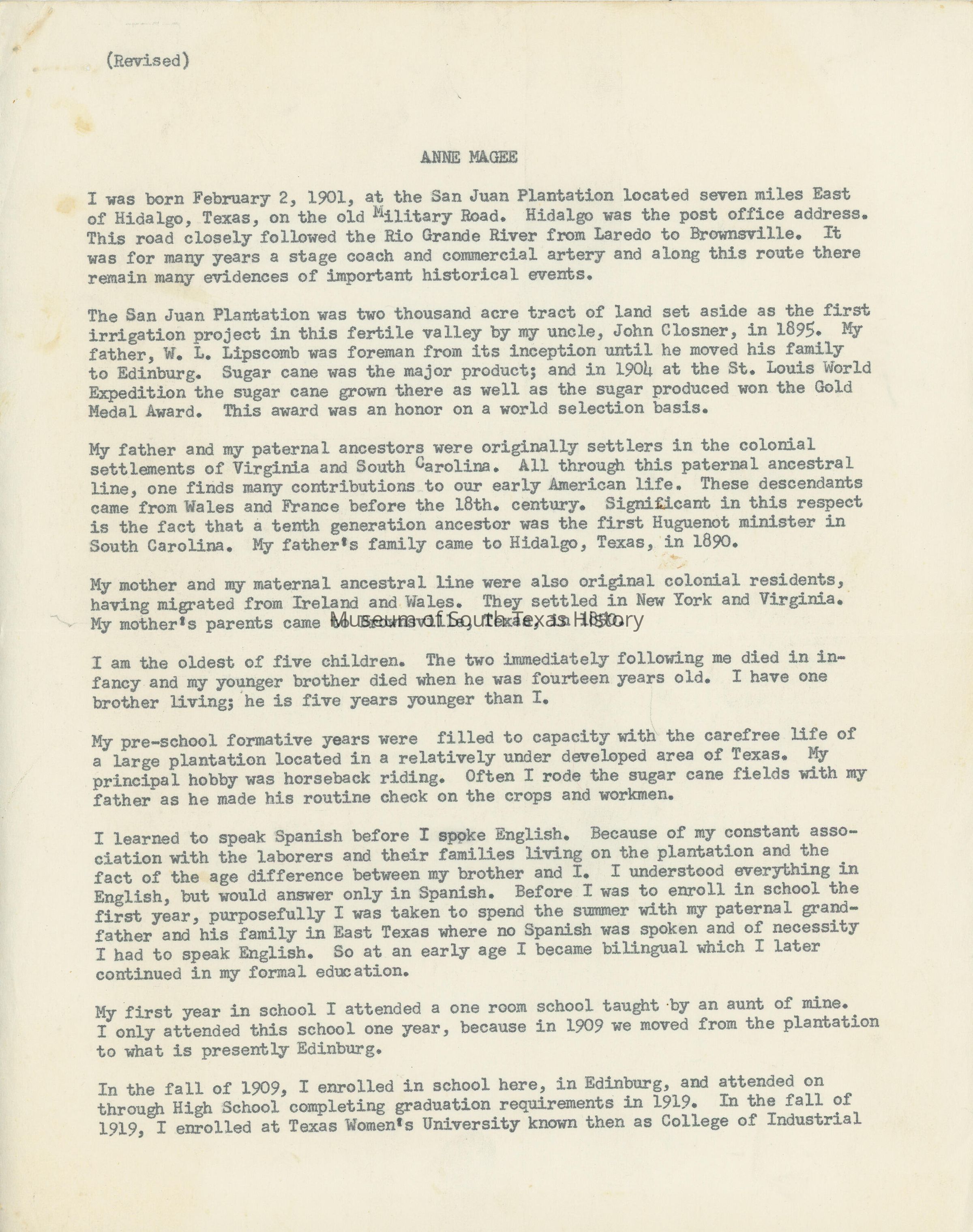 Anne Lipscomb Magee was the niece of Edinburg founder John Closnser. She grew up during a time when the Rio Grande Valley was young and was a witness to history. She was a member of the first graduating class of Edinburg High School. She served as both a teacher and administrator during the course of her career. She also organized the first Girl Scout troop in the valley, as well as the Hidalgo County Cripped Children's Society. A lifelong lover of history, she served as the chairman of the Hidalgo County Historical Society for a number of years.Collection