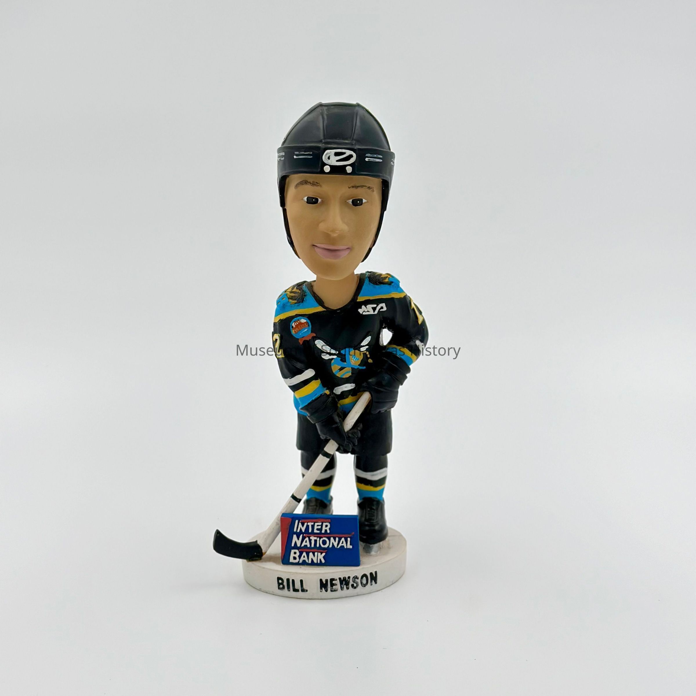 A collectible plaster doll with a bobbing head of RGV Killer Bees Hockey team play Bill Newson with International Bank sponsir detail at bottom front.Context