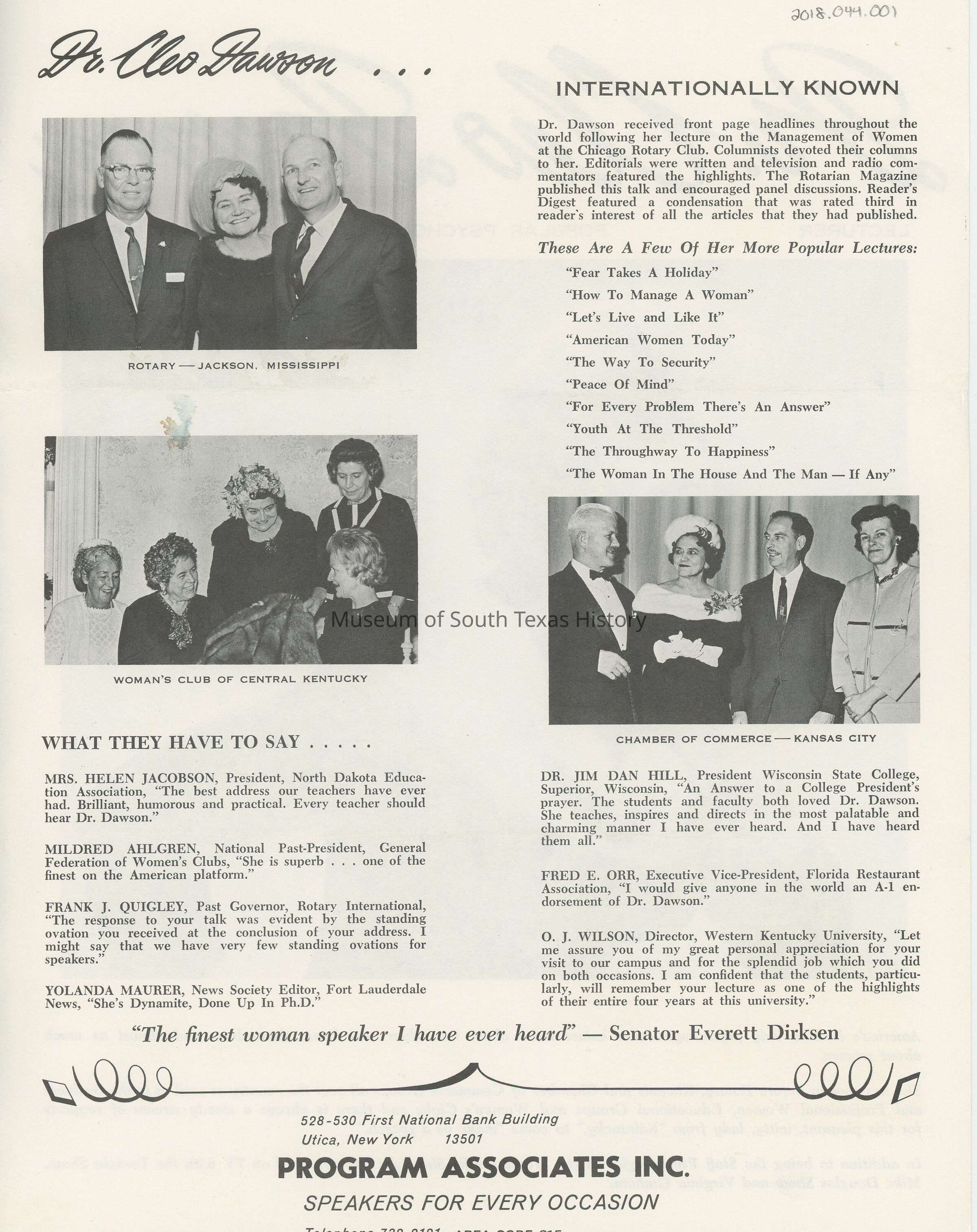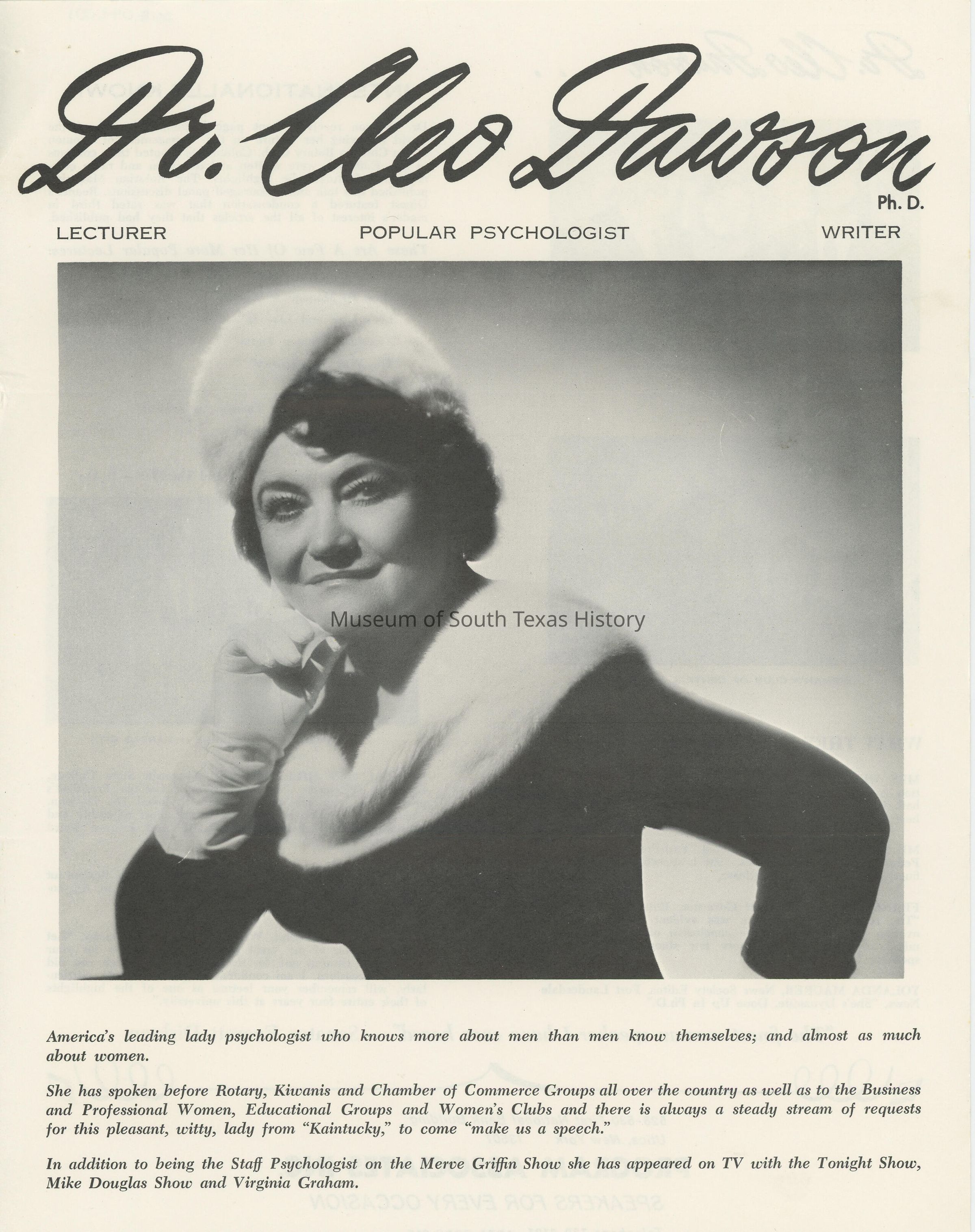 Brochure advertising Dr. Cleo Dawson's services as a lecturer, popular psychologist and writer.