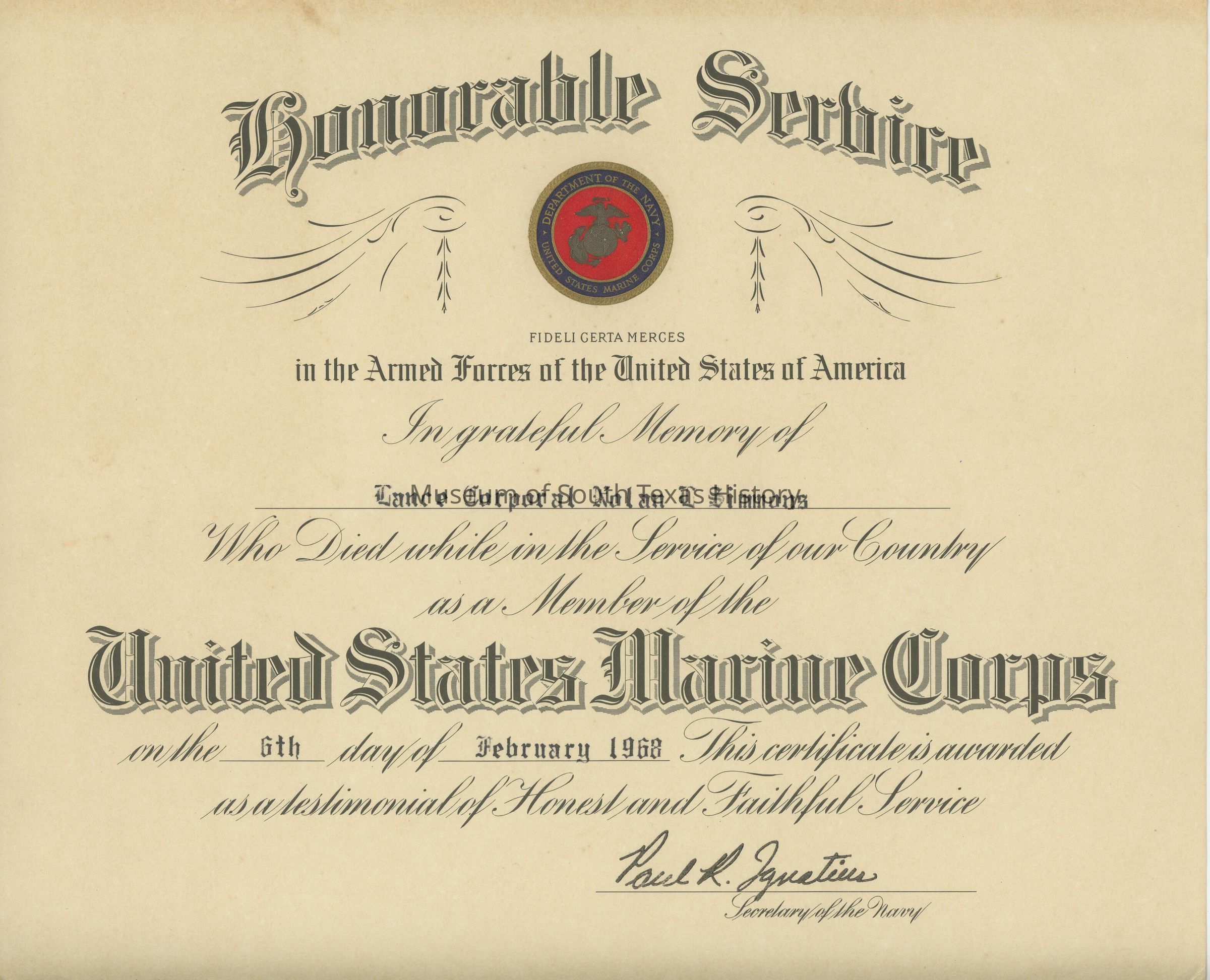 Certificate of honorable service issued to Nolan L. SimmonsCollection
