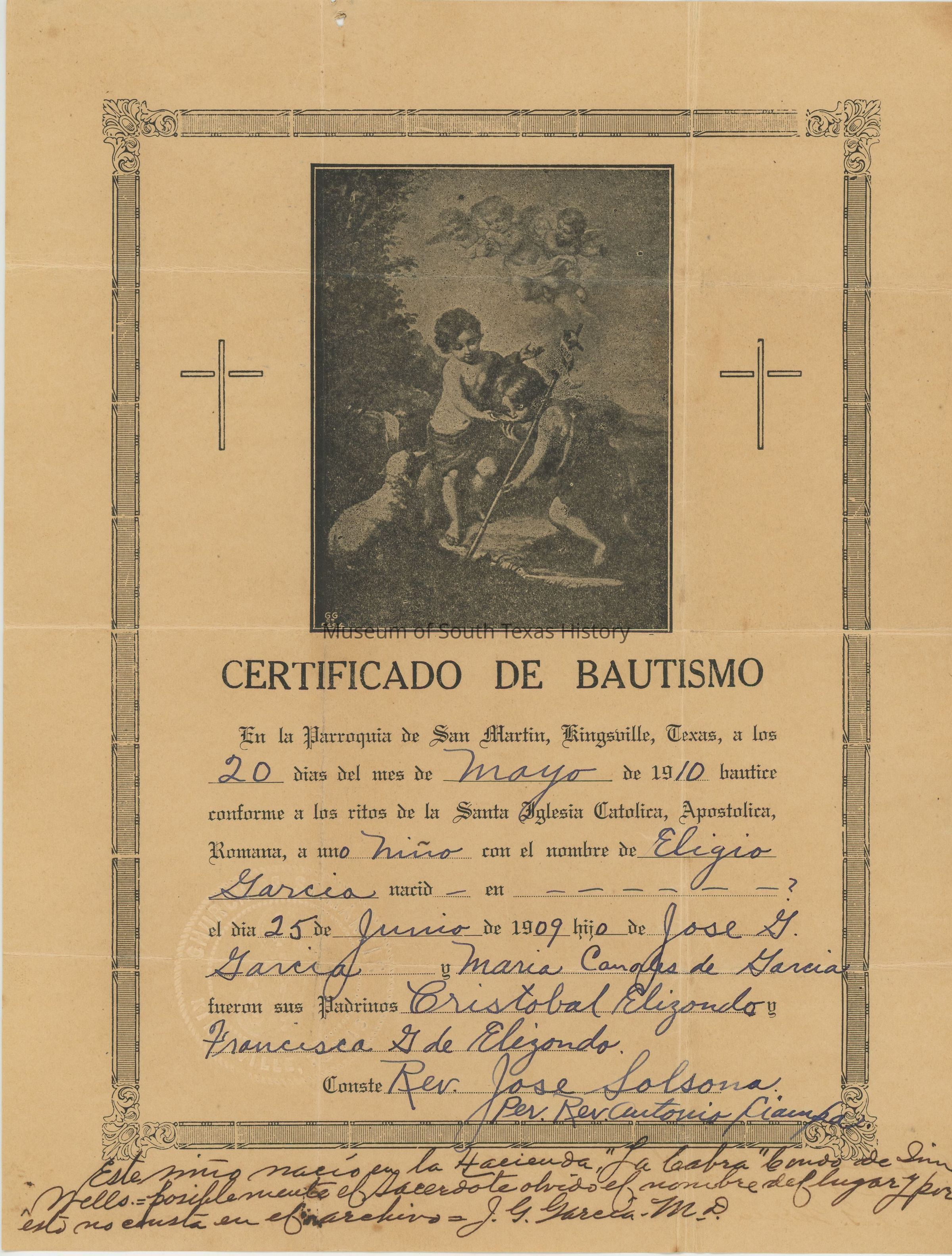 Baptism certificate for Eligio Garcia