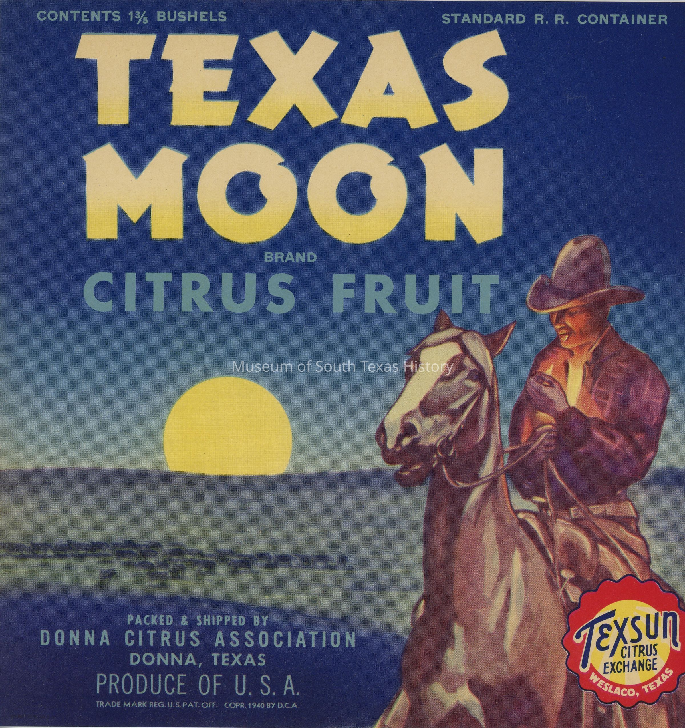 "Texas Moon" cowboy on horse lighting cigarette, Texsun Citrus Exchage, Weslaco. Donna Citrus, Donna. 1940