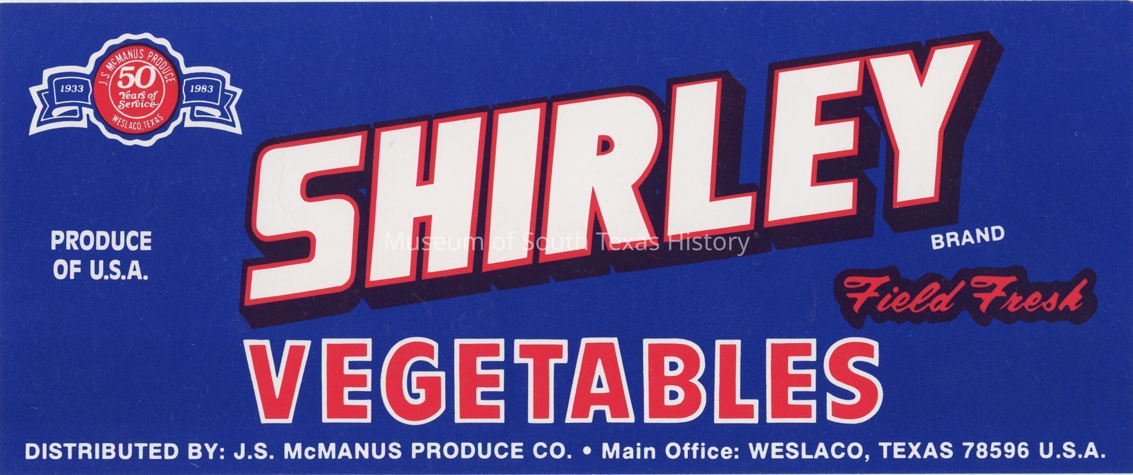Shirley Brand field fresh vegetables distributed by J.S. McManus Produce Company, Weslaco, Texas 78596Collection