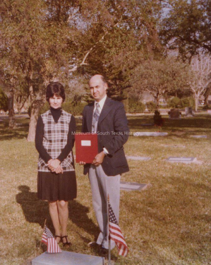 Photo of Dolia Gonzalez visiting the grave of her son, Alfredo "Freddy" Gonzalez. Accompanied by Sal Marroquin.Collection