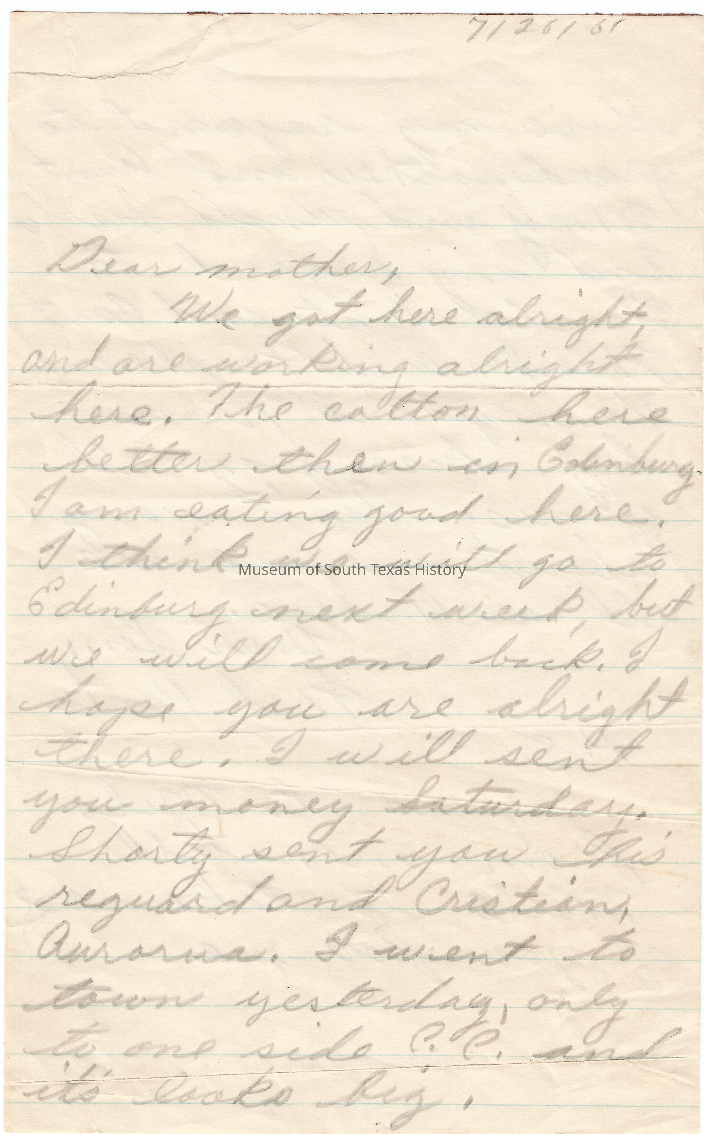 Letter dated July 25, 1961. Written by Alfredo Gonzalez to his mother, Dolia Gonzalez.Collection