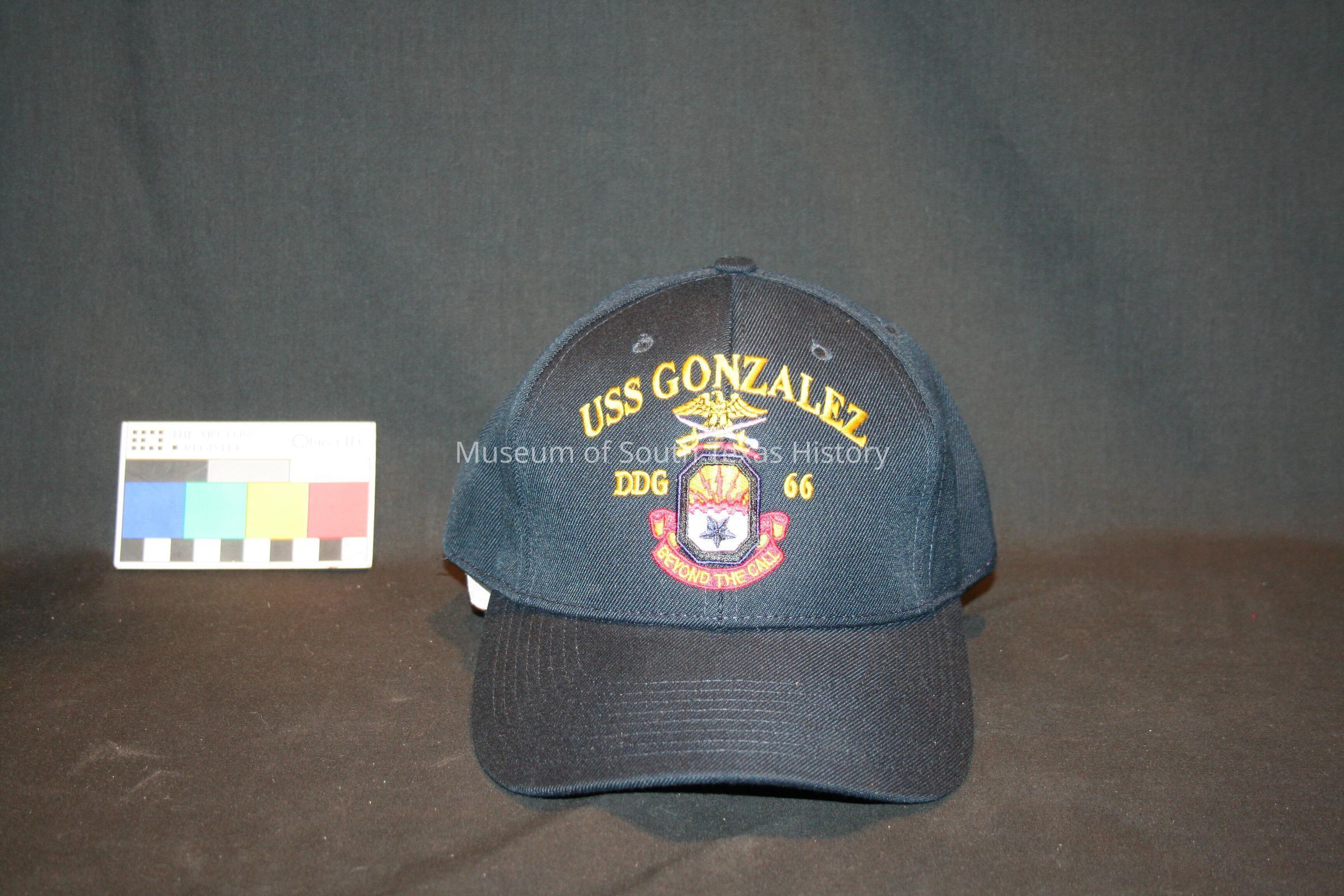 Baseball-style cap or hat, designs "USS Gonzalez DDG 66 Beyond The Call" with an eagle atop two crossed swords and an embroidered patch with a blue star on a white background and red rays on a yellow background. The inside label, "The Corps Santa Barbara California, Made in U.S.A. www.thecorps.com with the figure of a bulldog with a hat; blue cap with yellow, red and white.Collection