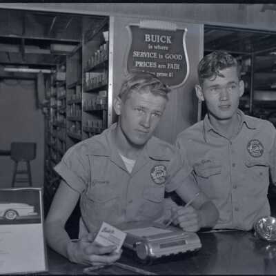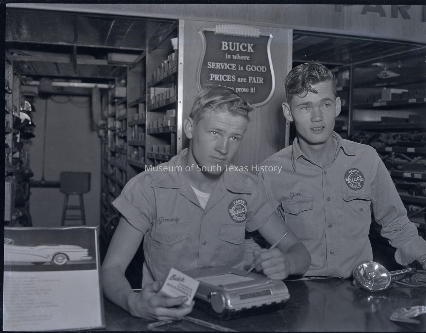 Photo of two men behind the counter of an unidentified garage or service station. The names on their shirts read Jimmy and Jim. Sign behind them says Buick is where service is good, prices are fair.Collection
