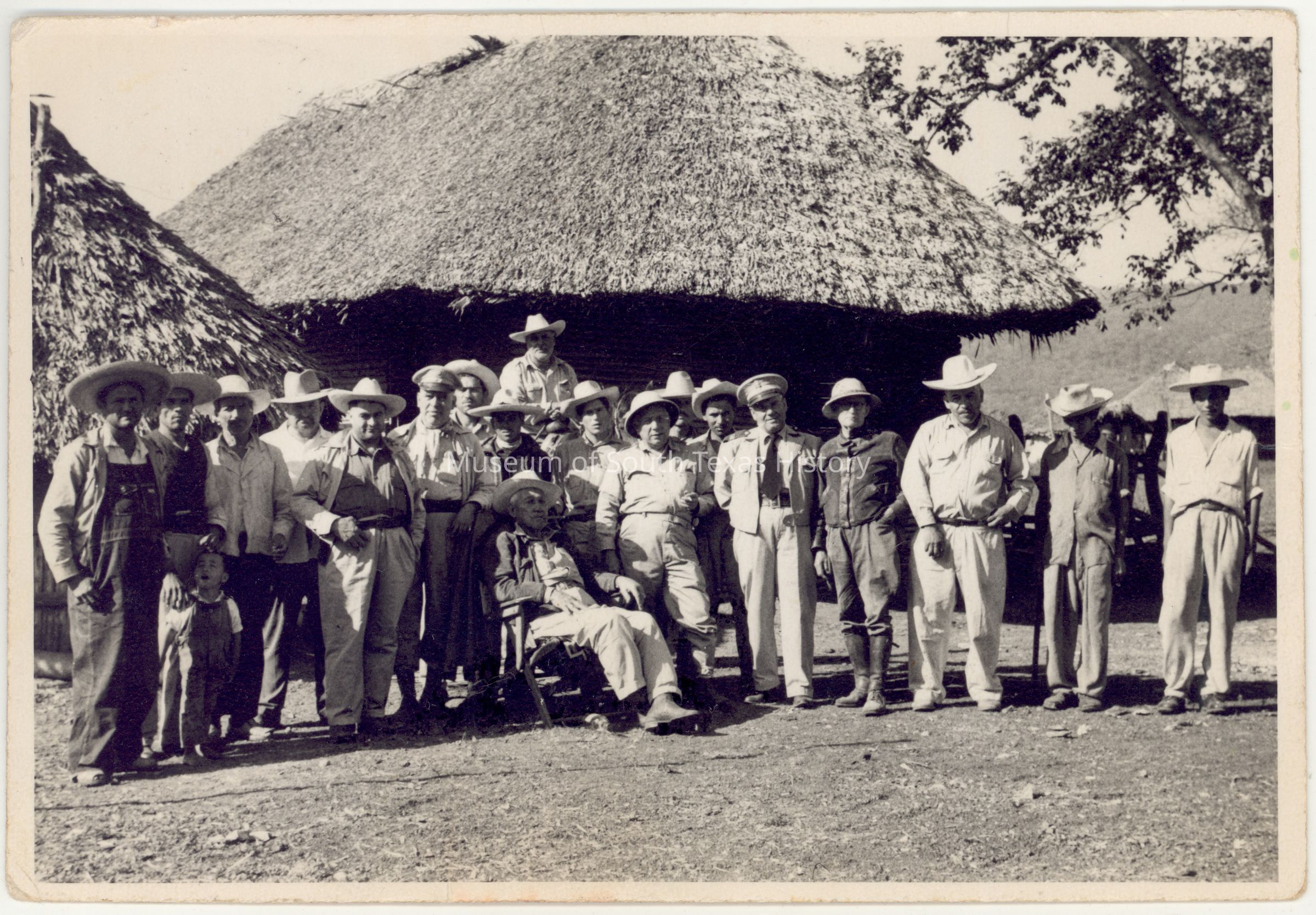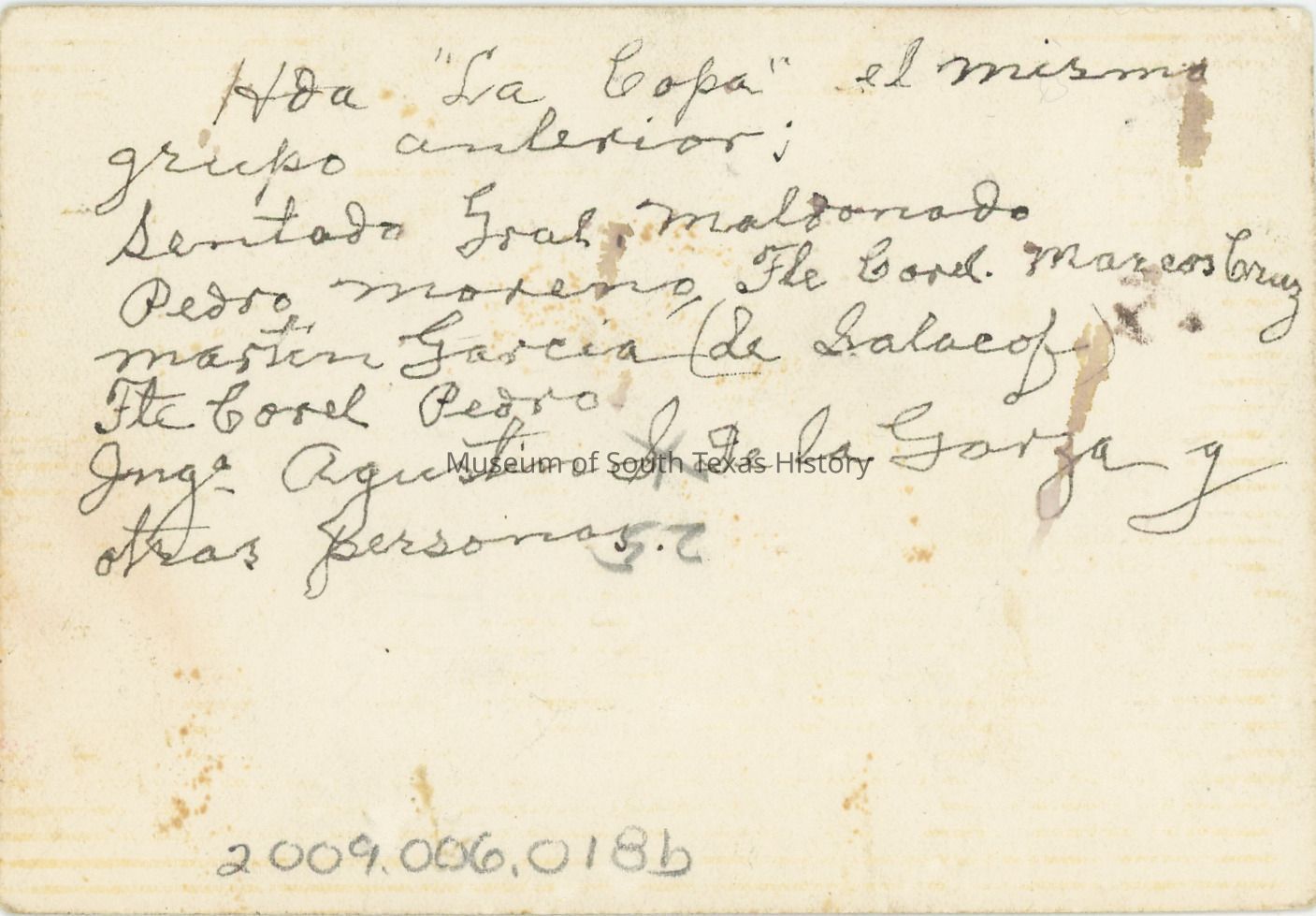 Photo of group Writing on back says: Hda "La Copa" el mismo grupo anterior: Sentado Gral Maldonado, Pedro Moreno, Fle. Cond. Marcos Cruz, Martin Garcia (de Salacof), Ftc Corel Pedro, Jnga Agustin de la Garza y otra personas.Collection