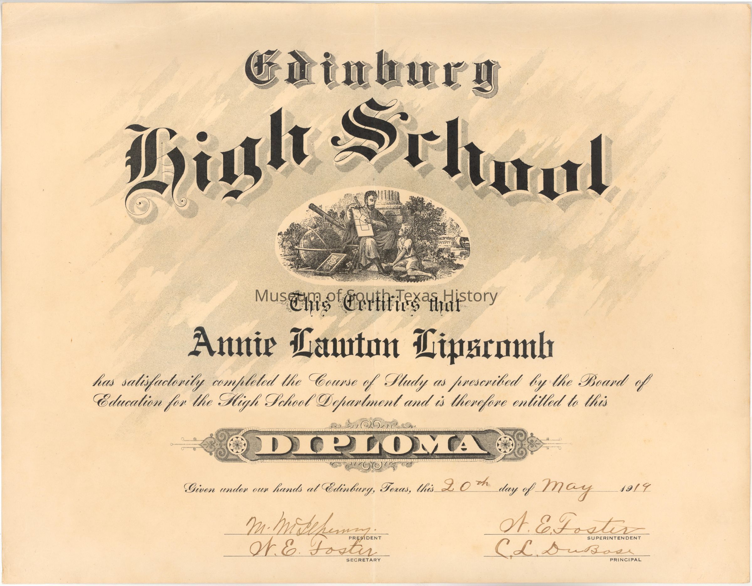 Diploma given to donor, a member of the first graduating class of Edinburg High School.