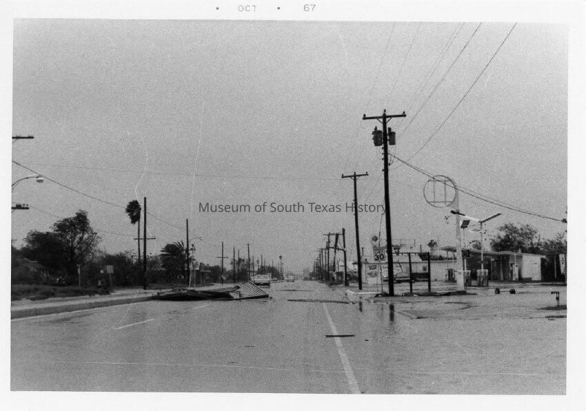 Views in and around Edinburg in the aftermath of Hurricane Beulah, 1967. The system made landfall in Texas around late September and caused major flooding, wind, and tornado damage.Collection