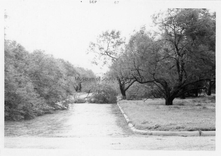 Views in and around Edinburg in the aftermath of Hurricane Beulah, 1967. The system made landfall in Texas around late September and caused major flooding, wind, and tornado damage.Collection