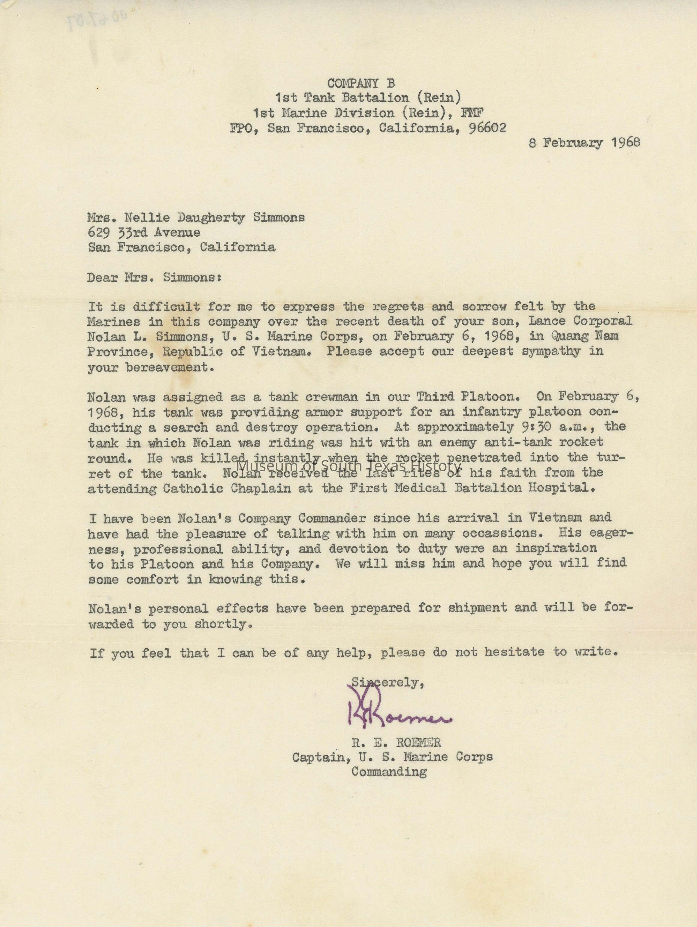Letter from Captain R.E. Roemer to Nellie Simmons regarding the death of her sonCollection