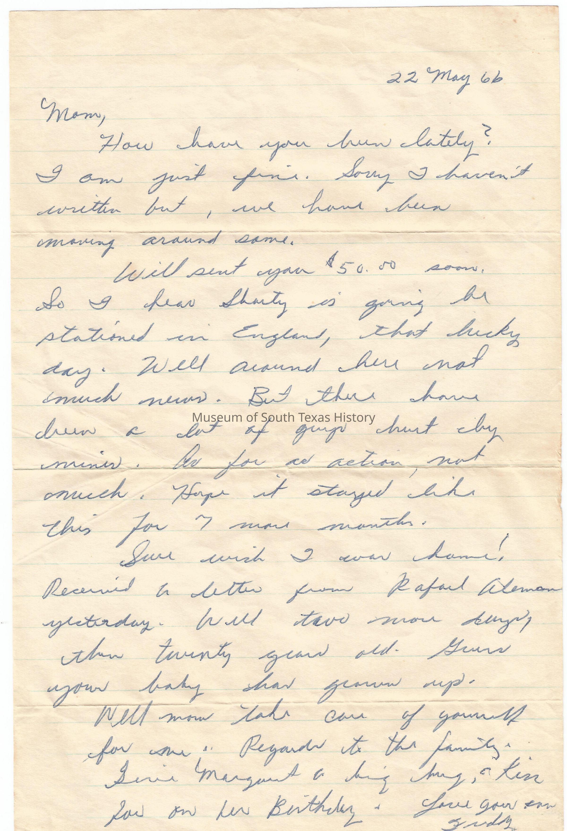 Letter from Freddy Gonzalez to his mother