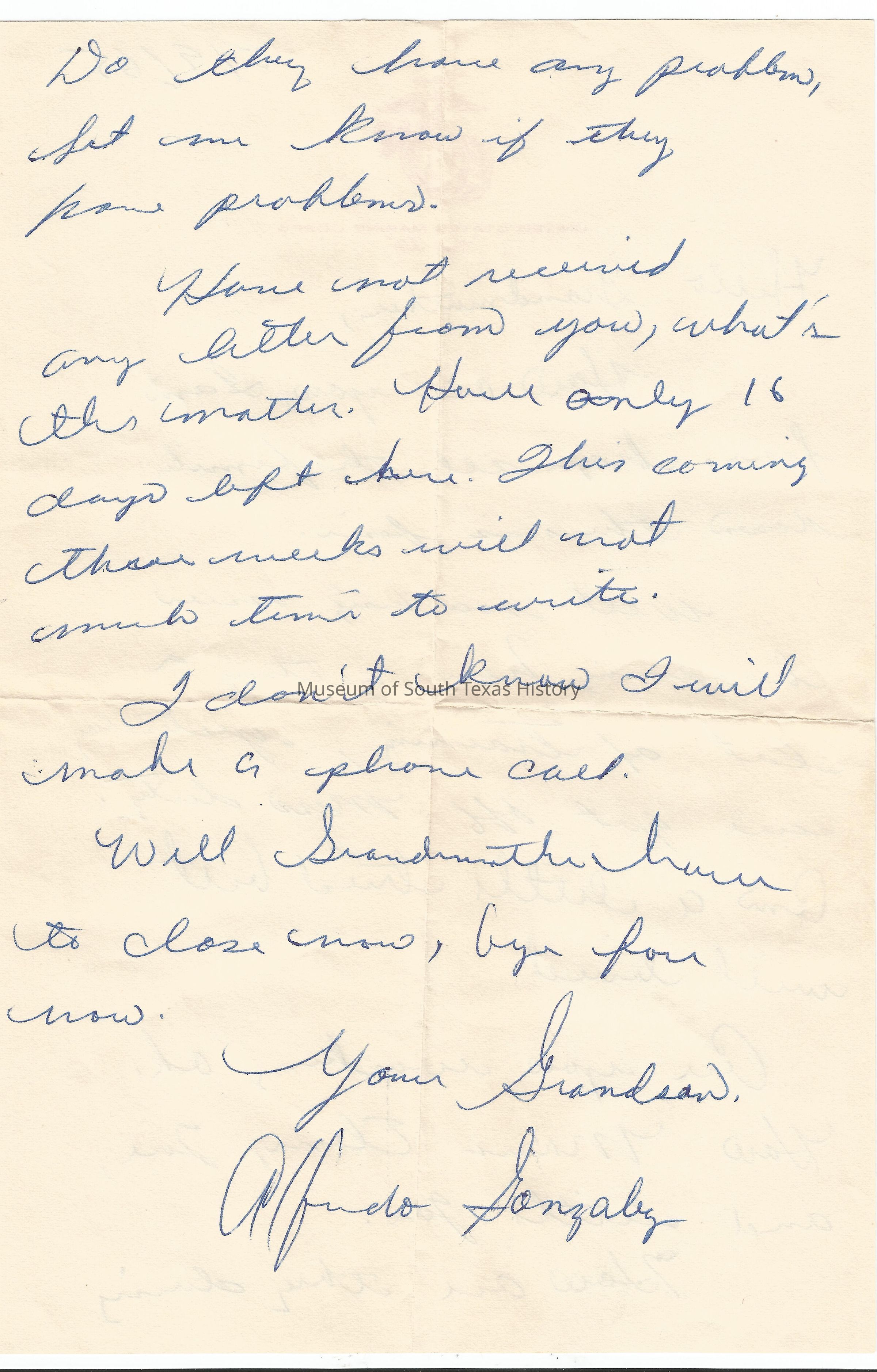 Letter from Alfredo Gonzalez to his grandmother Herminia GonzalezCollection