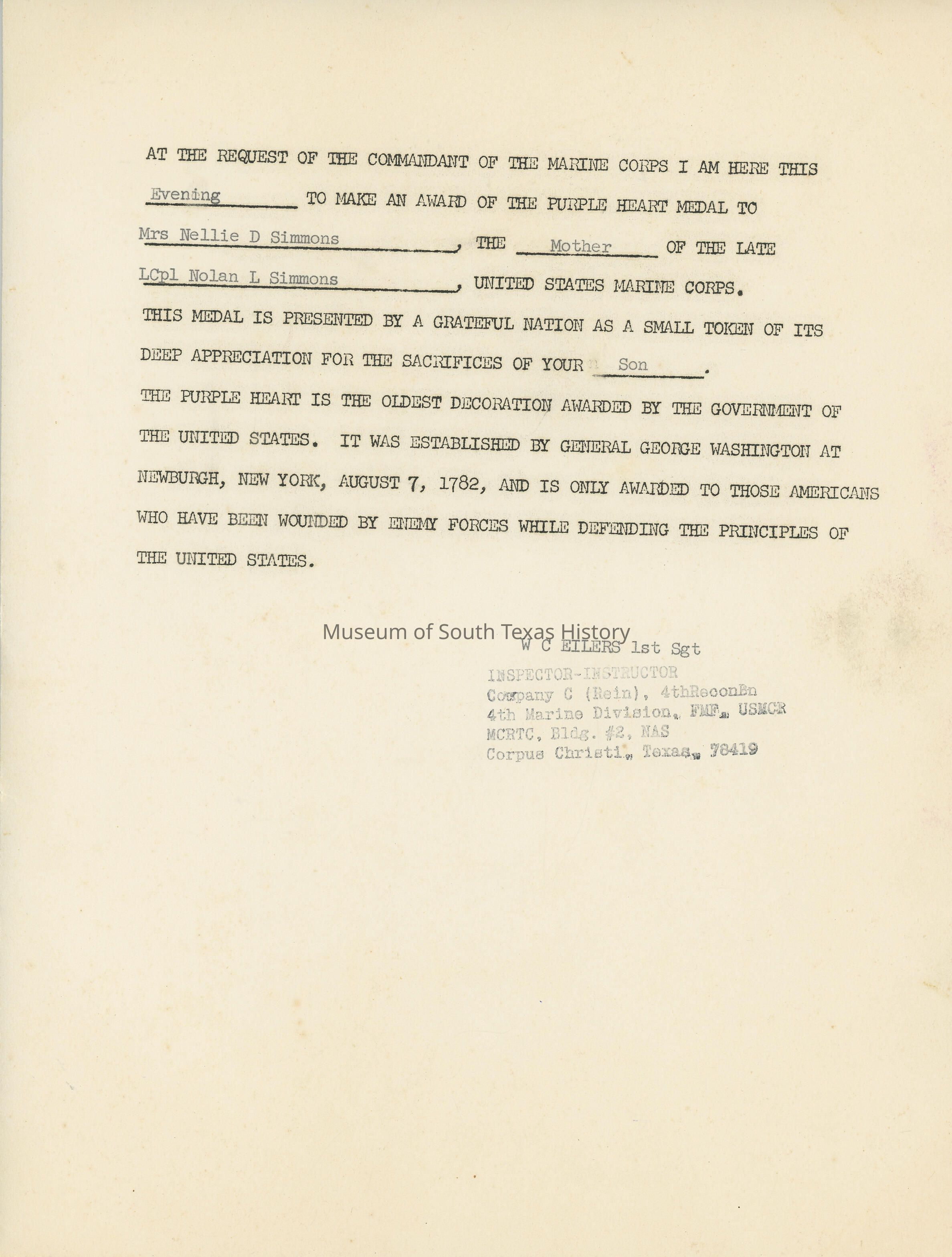 Letter indicating Purple Heart medal for Nolan L. Simmons will be given to his mother, Nellie D. SimmonsCollection