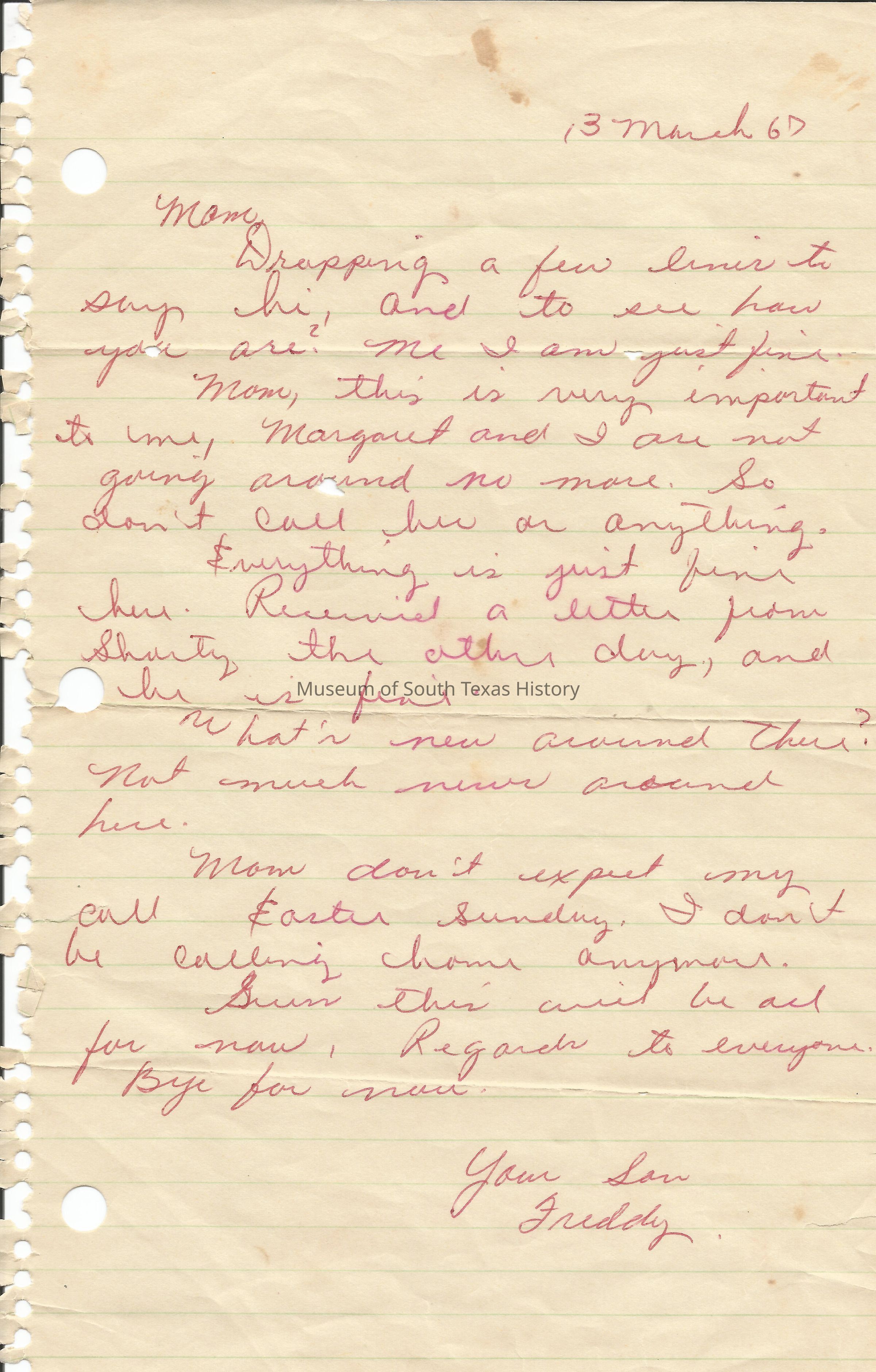 Letter from Freddy Gonzalez to his mother