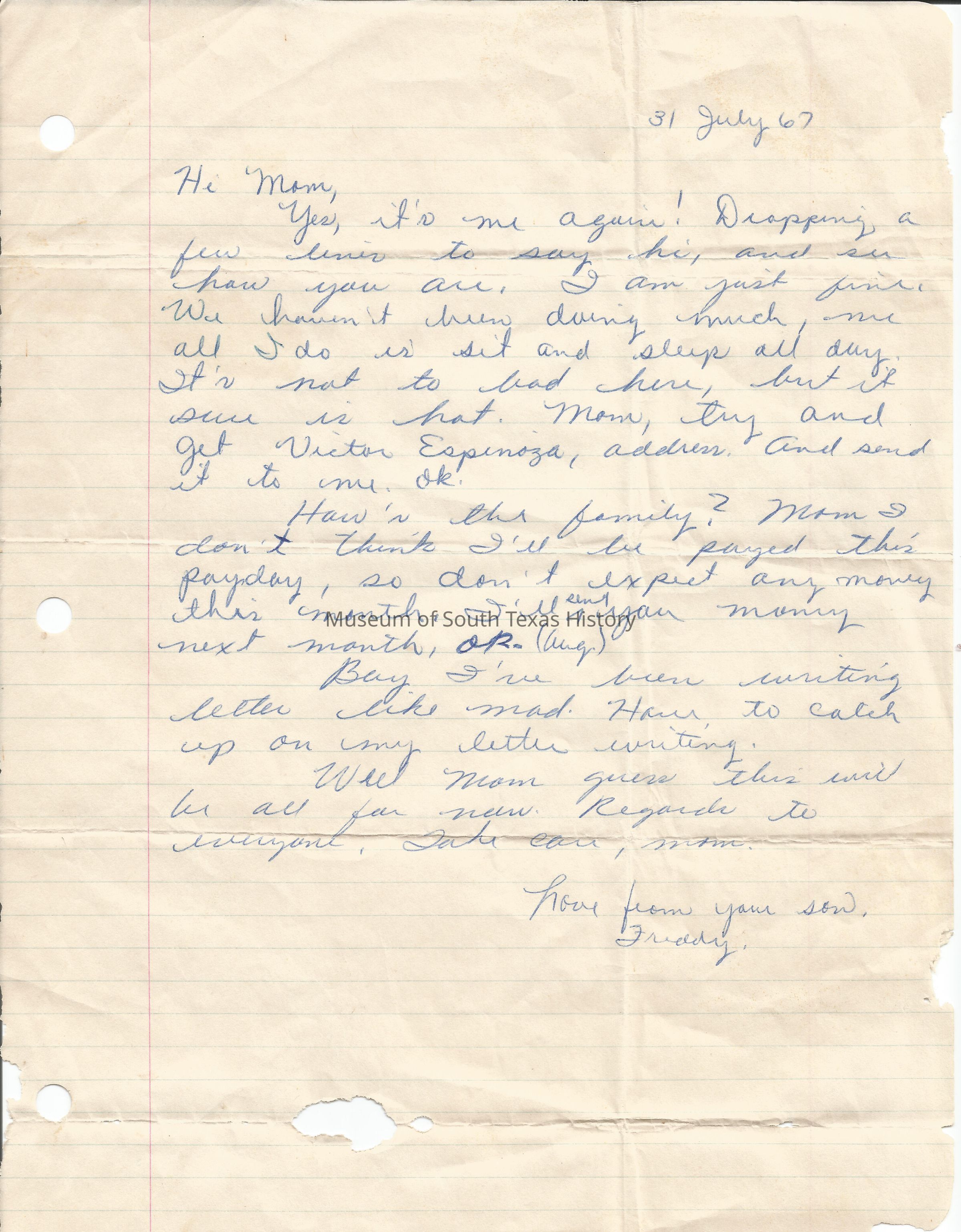 Letter from Freddy Gonzalez to his mother