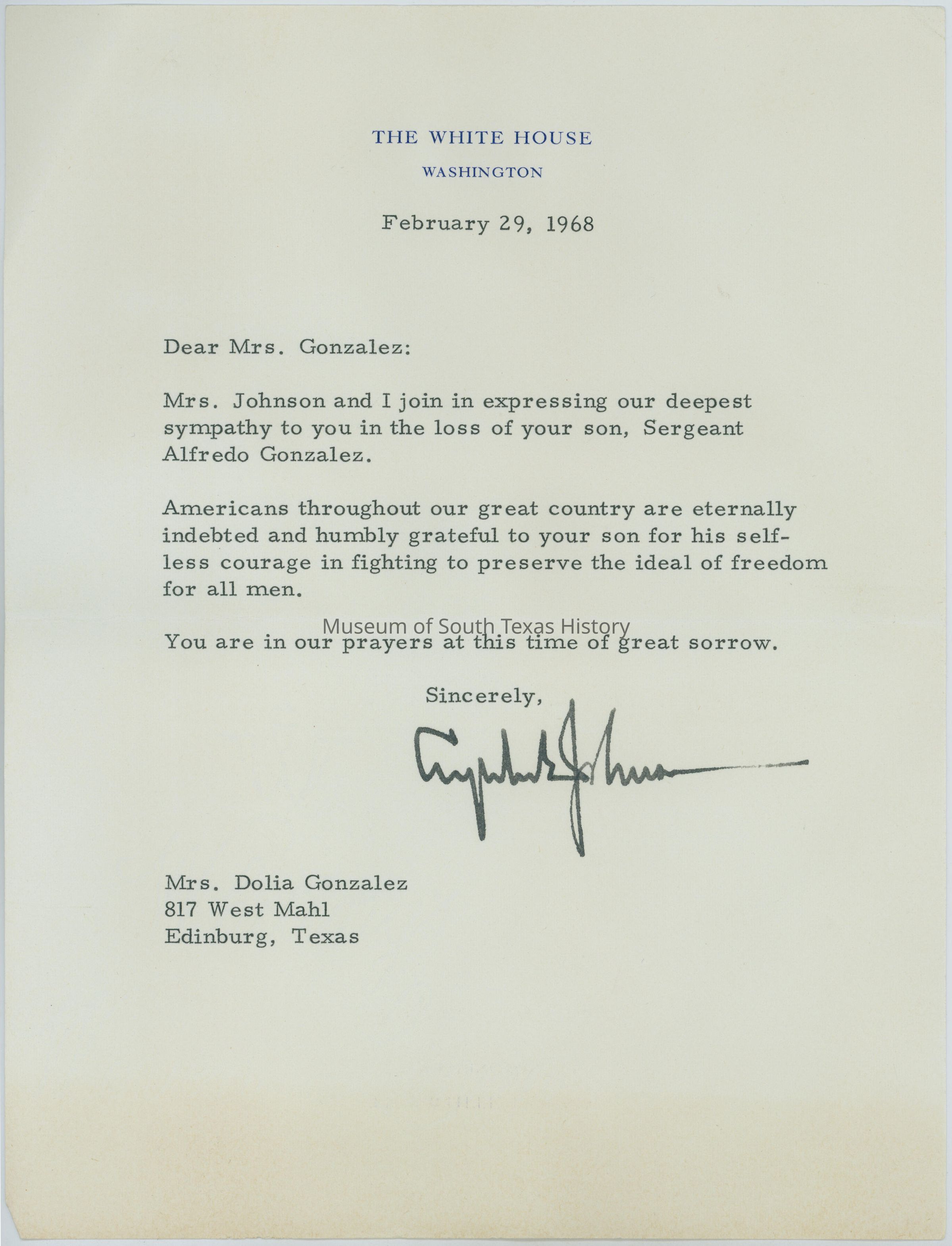 Letter from President and Mrs. Johnson expressing condolences to Mrs. Gonzalez