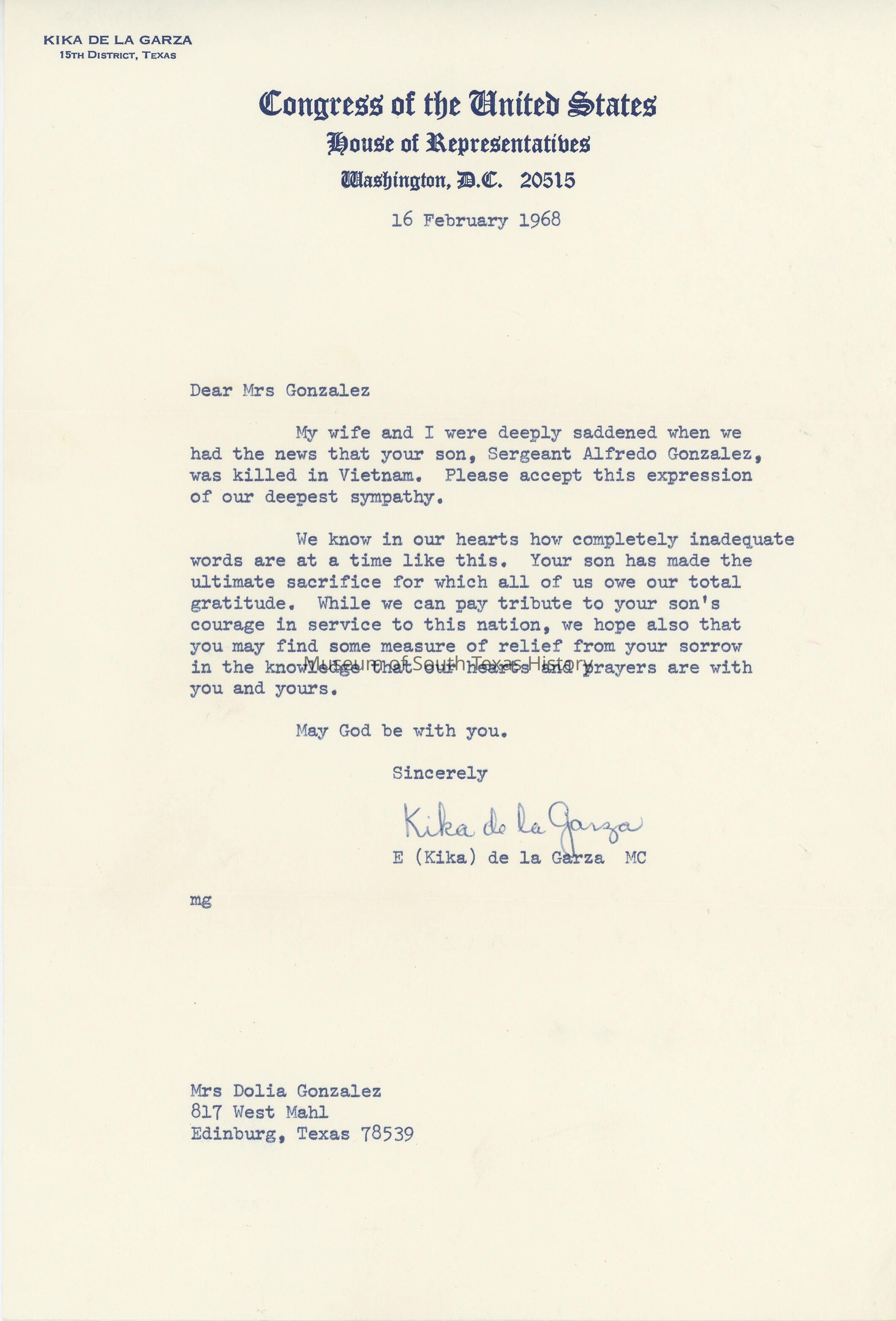 Letter of condolence from U.S. Congressman Kika de la Garza to Dolia Gonzalez dated February 16, 1968.Collection