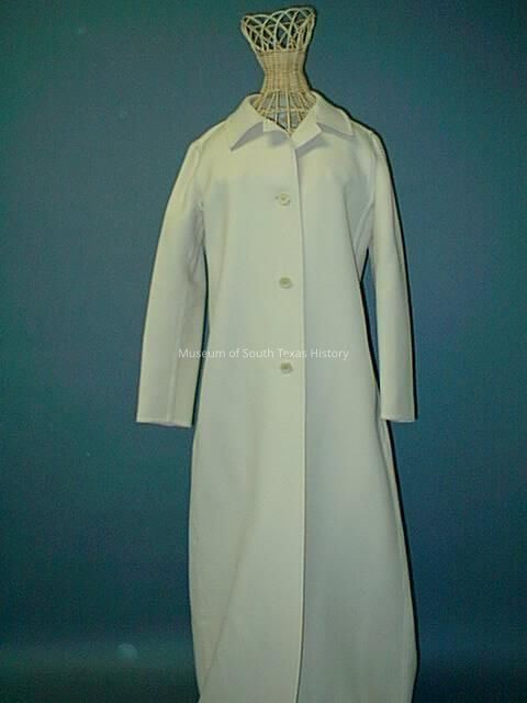 Full-length, cream wool gabardine coat with long sleeves, shirt-style collar, and four-button front opening. Coat is self-lined and features sewn-in label, "Halston," at interior back neck. Anne Legendre Armstrong wore this coat and a matching Halston dress for her presentation, circa 1976, to Queen Elizabeth II while serving as U. S. Ambassador to Great Britain. Armstrong accessoried the ensemble with a pearl necklace.