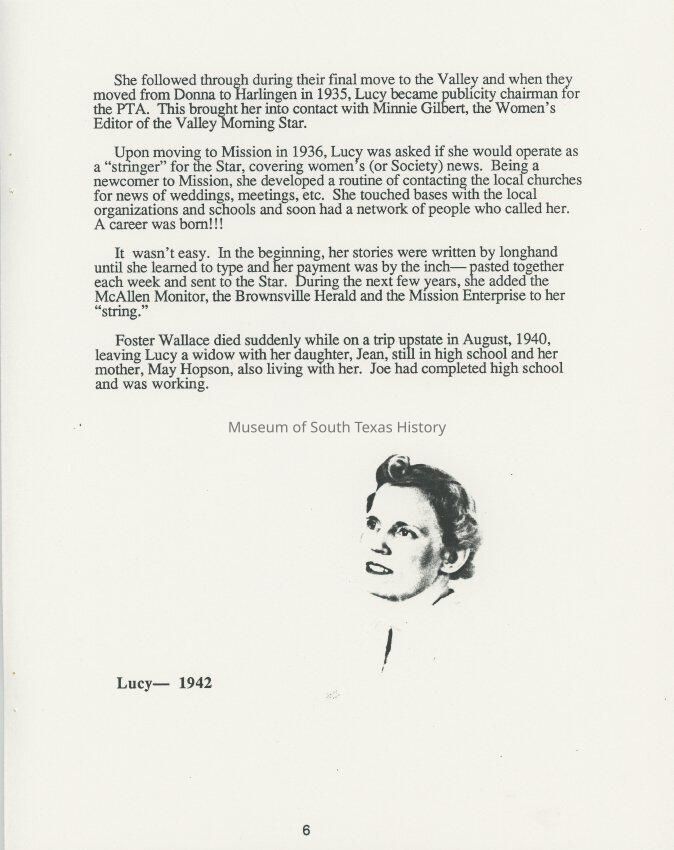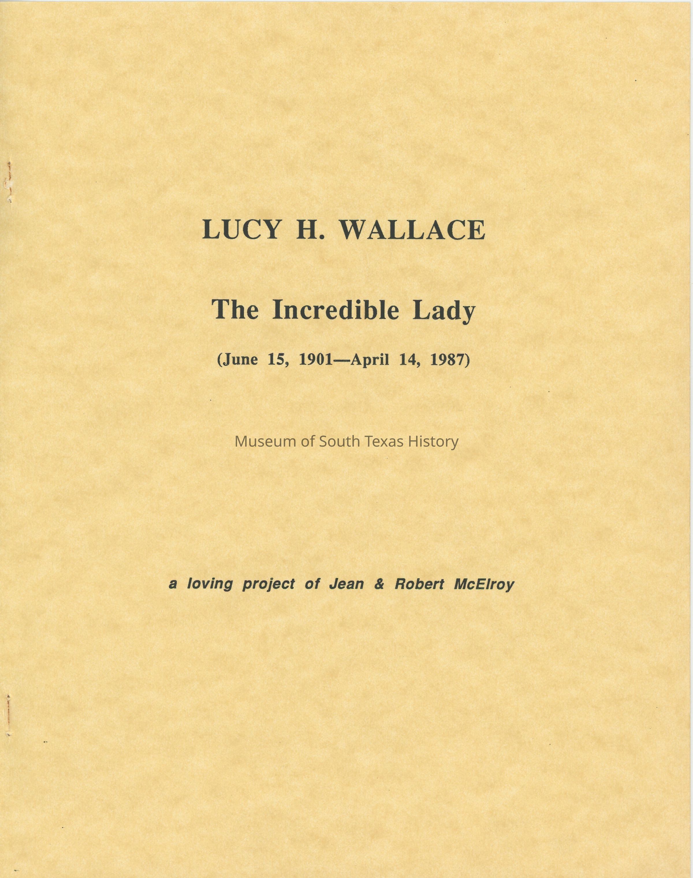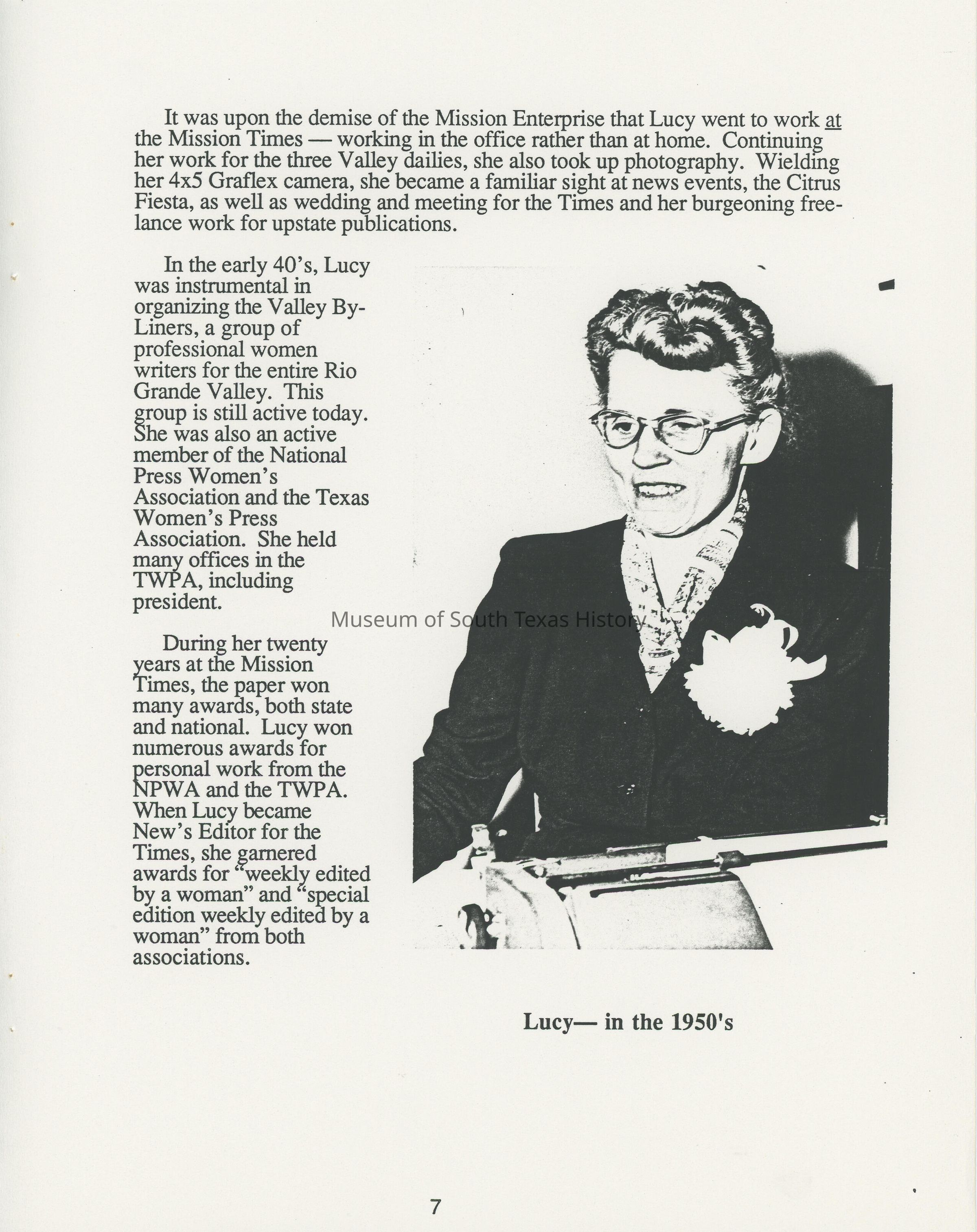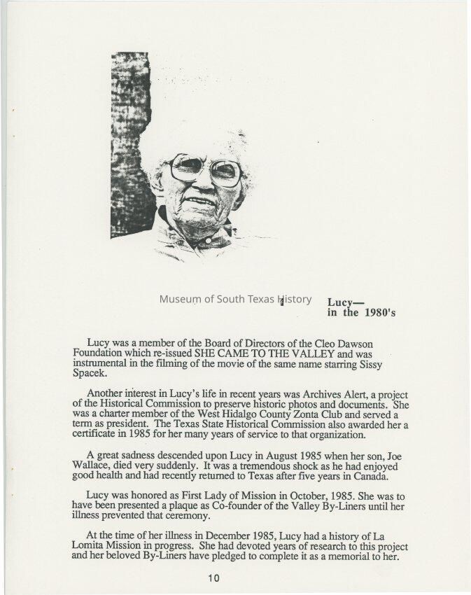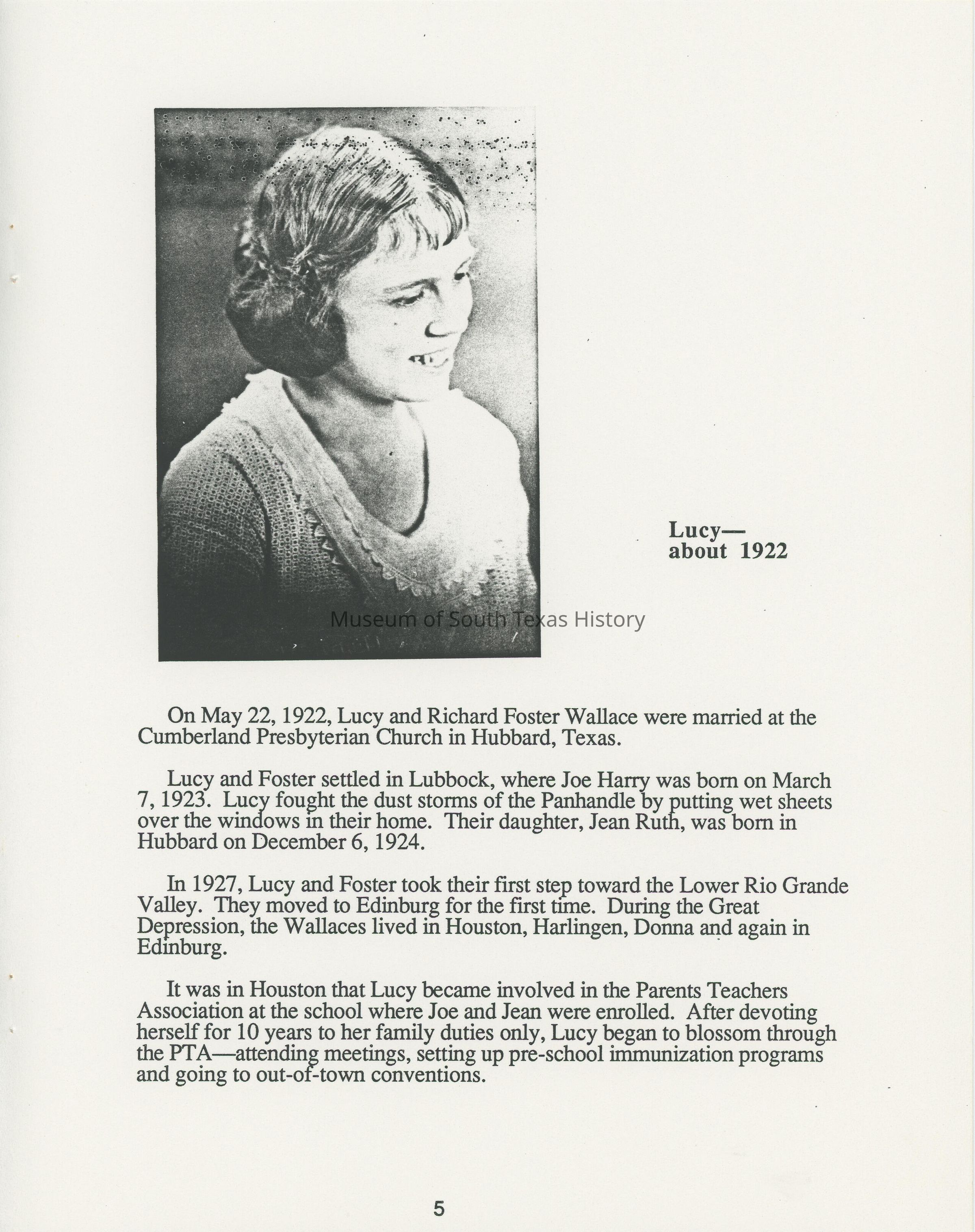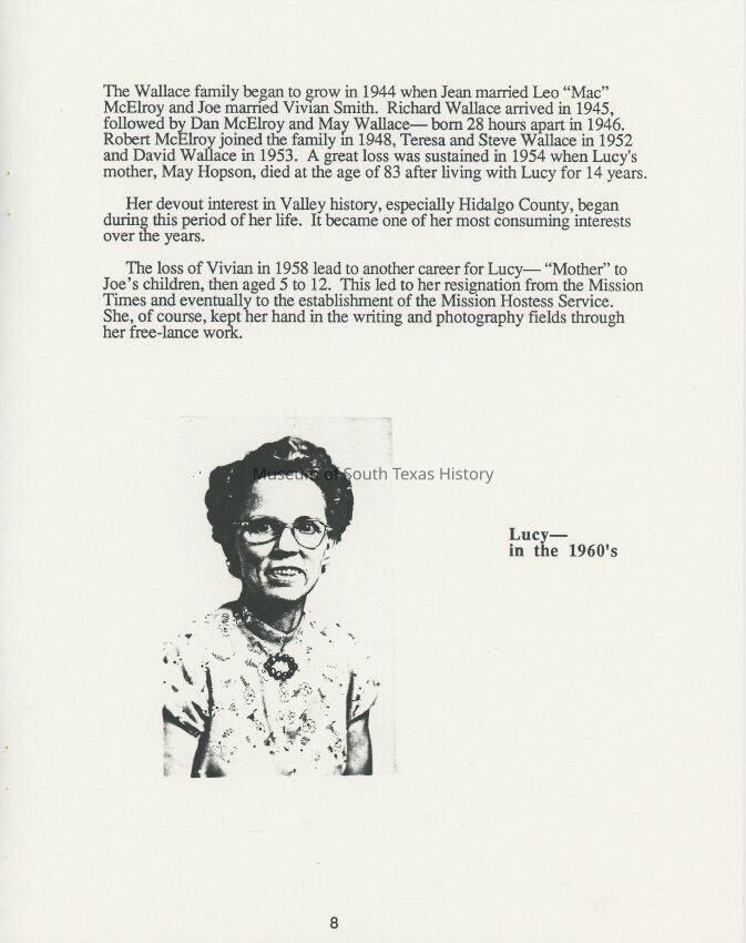 Lucy Wallace was a woman who wore many hats. She was an active member of the Parent Teacher's Association, a photographer, and a published author. She wrote articles for the Valley Morning Star, McAllen Monitor, Brownsville Herald, and the Mission Enterprise. She had a long career as a journalist. In addition, she also served as president of the Texas Women's Press Association, helped organize the Valley By-Liners, and was a charter member of the Hidalgo County Historical Commission.Collection