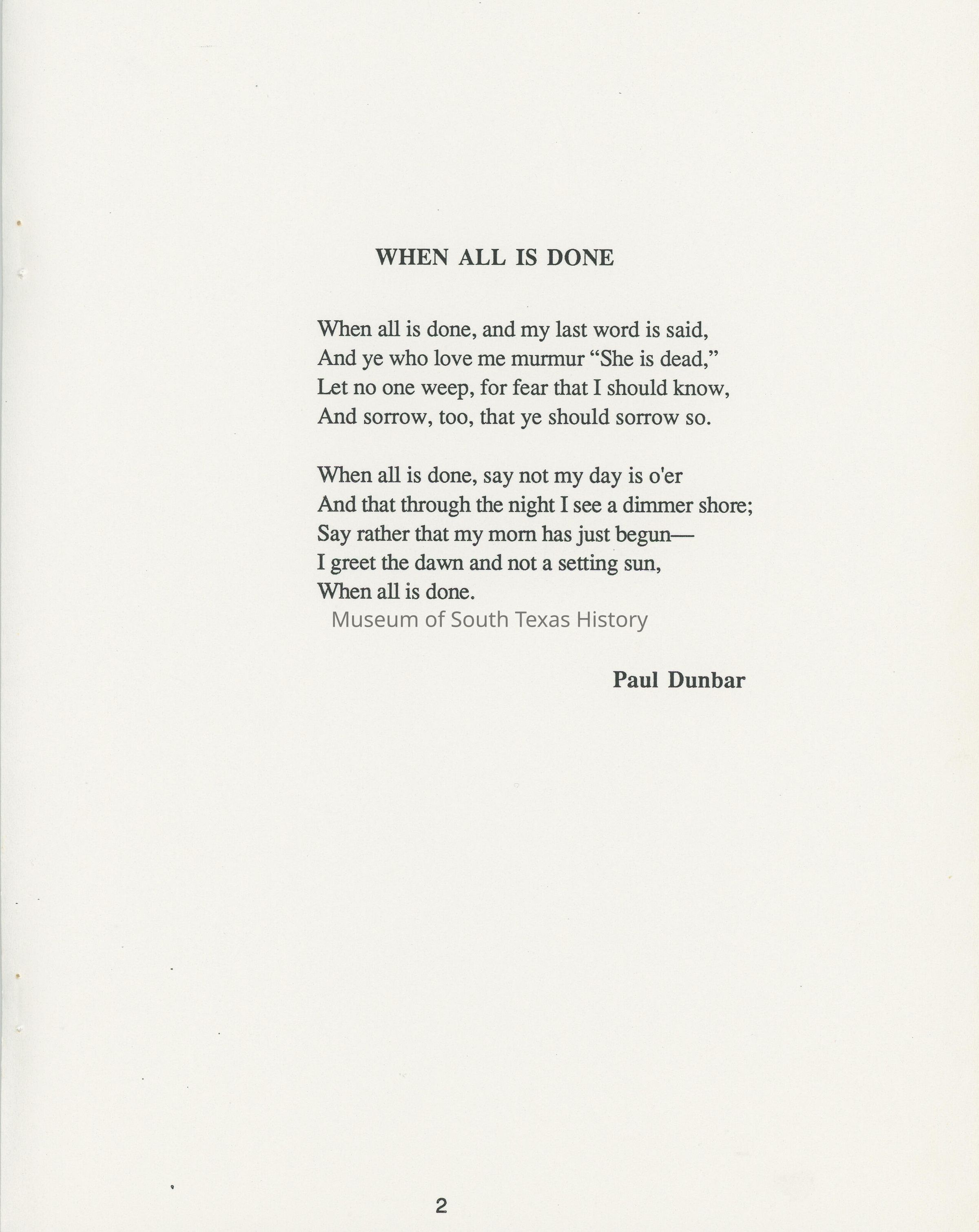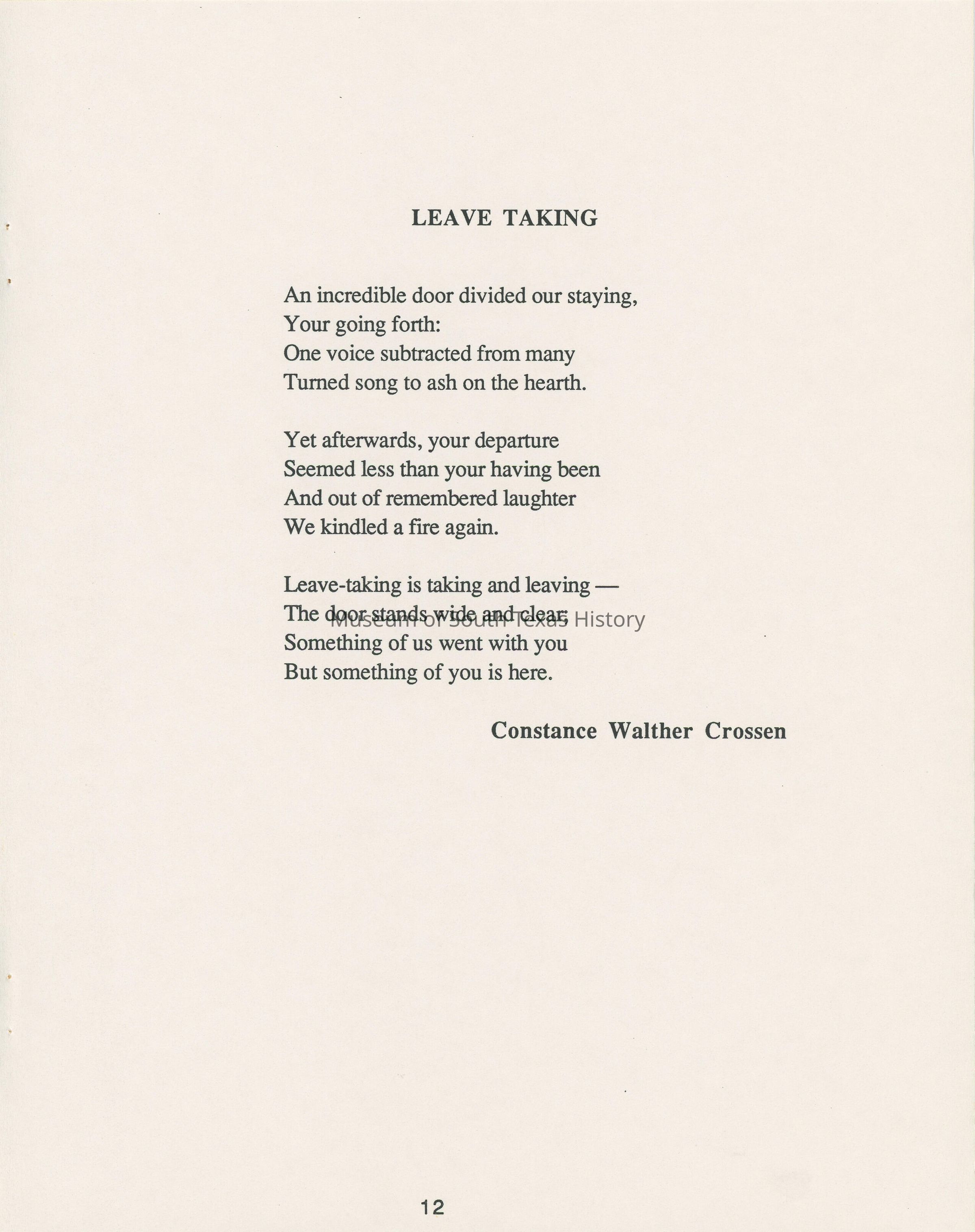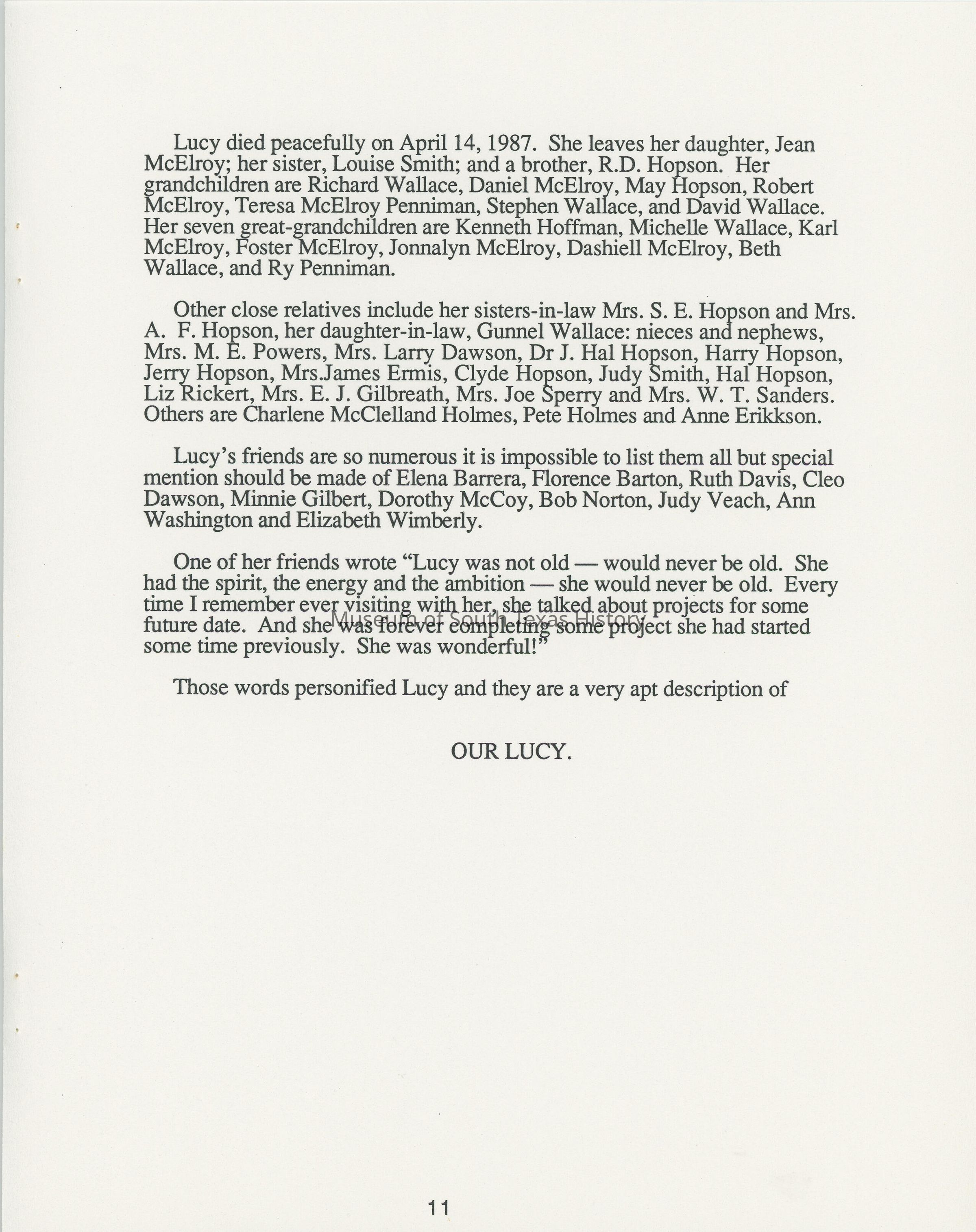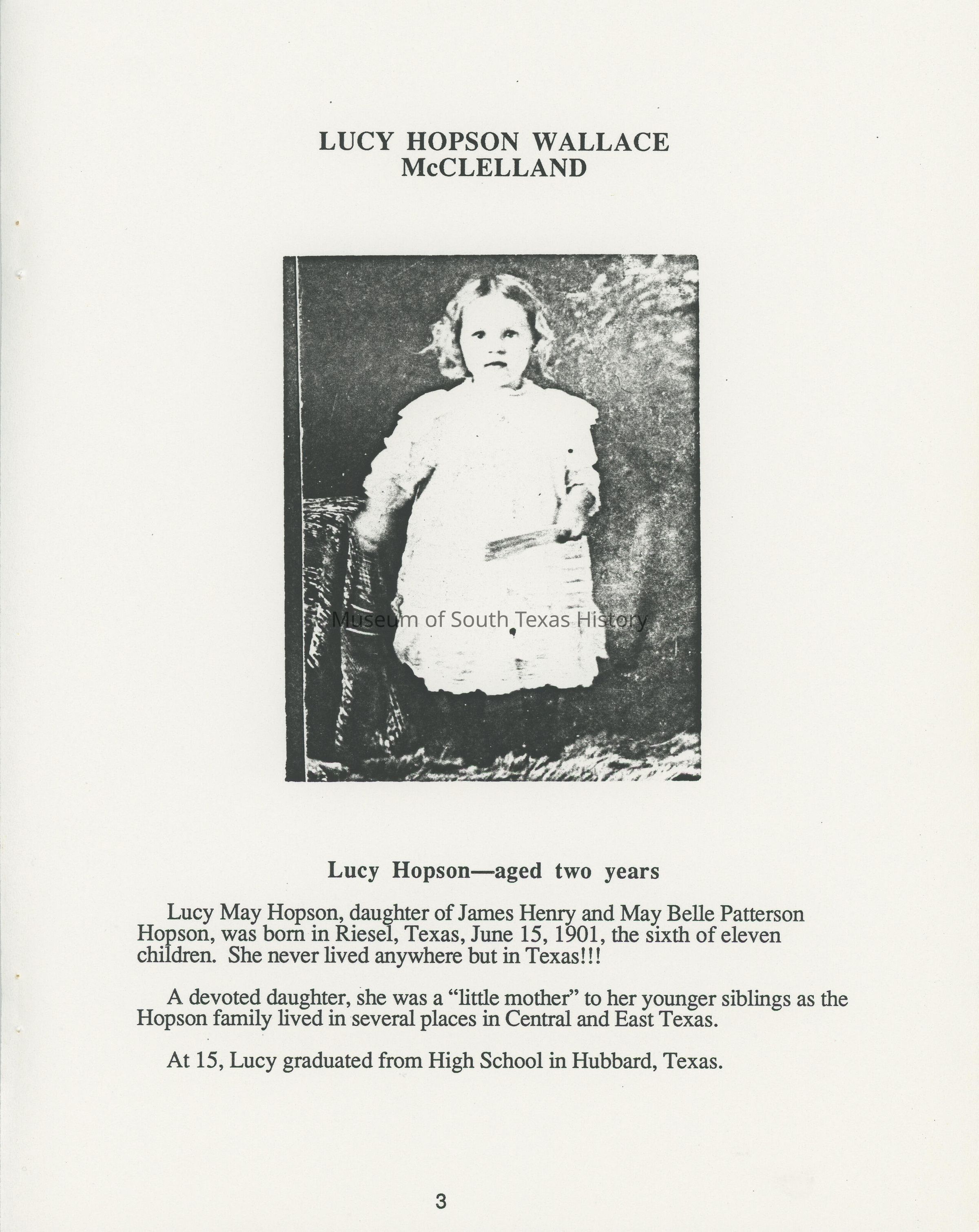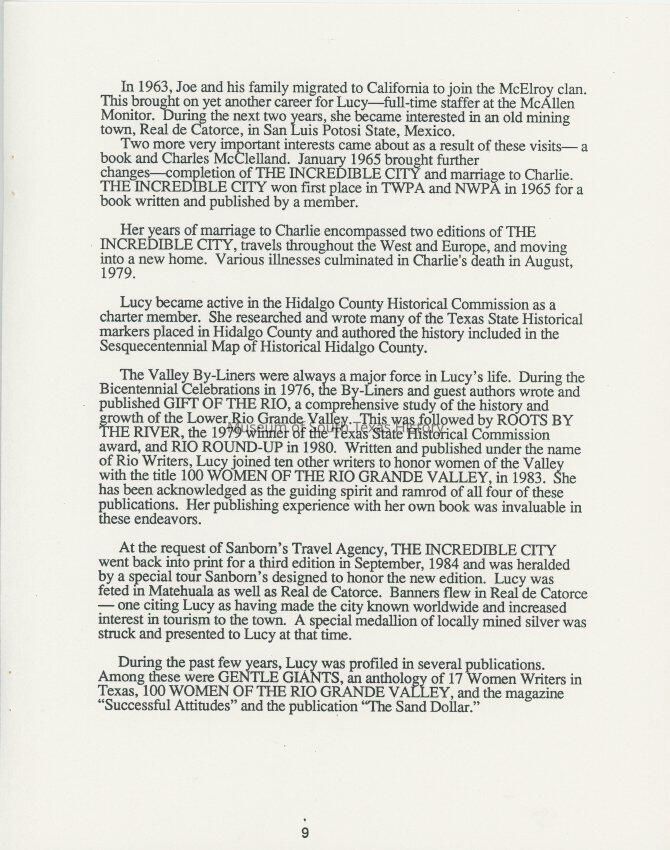 Lucy Wallace was a woman who wore many hats. She was an active member of the Parent Teacher's Association, a photographer, and a published author. She wrote articles for the Valley Morning Star, McAllen Monitor, Brownsville Herald, and the Mission Enterprise. She had a long career as a journalist. In addition, she also served as president of the Texas Women's Press Association, helped organize the Valley By-Liners, and was a charter member of the Hidalgo County Historical Commission.Collection